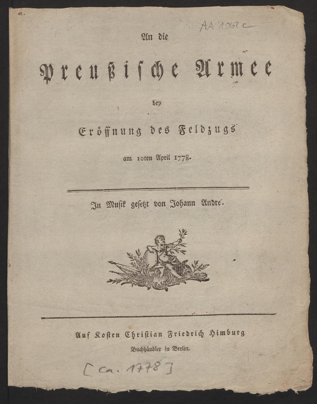 | Alternative. Title | An die Preußische Armee bey Eröffnung des Feldzugs am 10ten April 1778. In Musik gesetzt von Johann André |