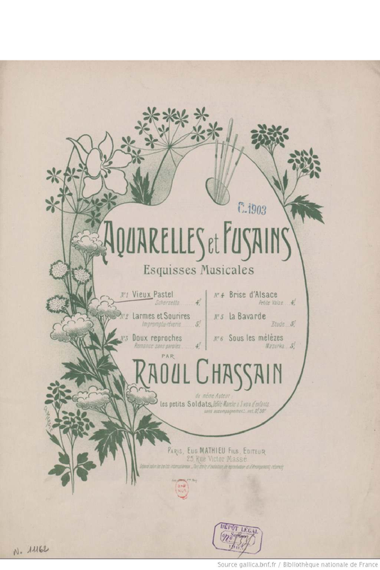 ⇒ 6 more: No.1 Vieux pastel / Scherzetto • No.2 Larmes et sourires / Impromptu-rêverie • No.3 Doux reproches / Romance sans paroles • No.4 Brise d'Alsace / Petite Valse • No.5 La bavarde / Etude • No.6 Sous les mélèzes / Mazurka