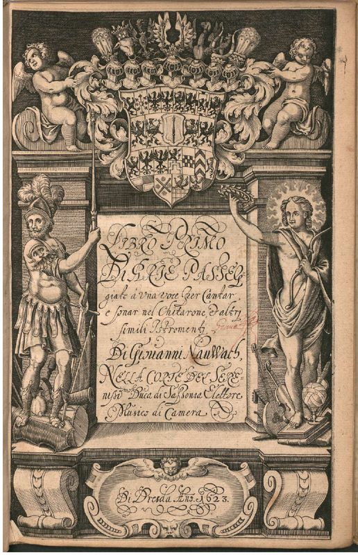 Libro Primo di Arie, passegiate á una voce per cantar, e sonar del Chitarone, +& altri simile instromenti, di Giuanni Nauwach, nella corte del serenissiomo Duca di Sassonia Elettore Musico di Camera