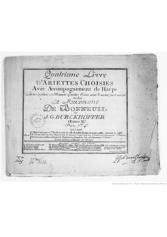 | Alternative. Title | Quatrième livre d'ariettes choisies avec accompagnement de harpe suivies de plusieurs menuets et petites pièces pour le même instrument. |