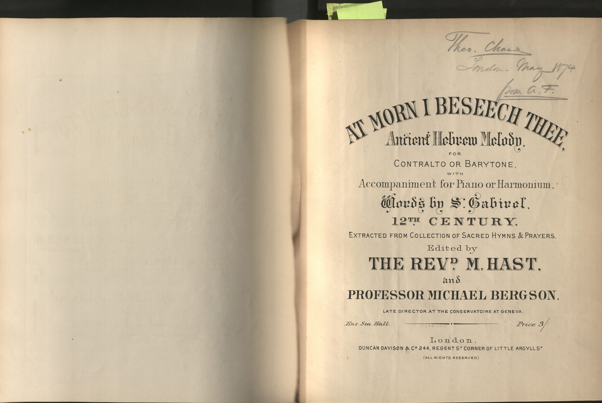 | Alternative. Title | At Morn I Beseech Thee, Ancient Hebrew Melody, for Contralto or Barytone, with Accompaniment for Piano or Harmonium ... extracted from Collection of Sacred Hymns & Prayers, edited by the Revd. Marcus Hast, and Professor Michał Bergson Shachar avakesheho / Früh Morgens flehe ich |