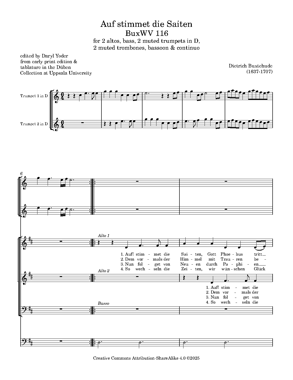 | Instrumentation | 2 altos, bass, 2 trumpets, 2 trombones, bassoon, continuo |