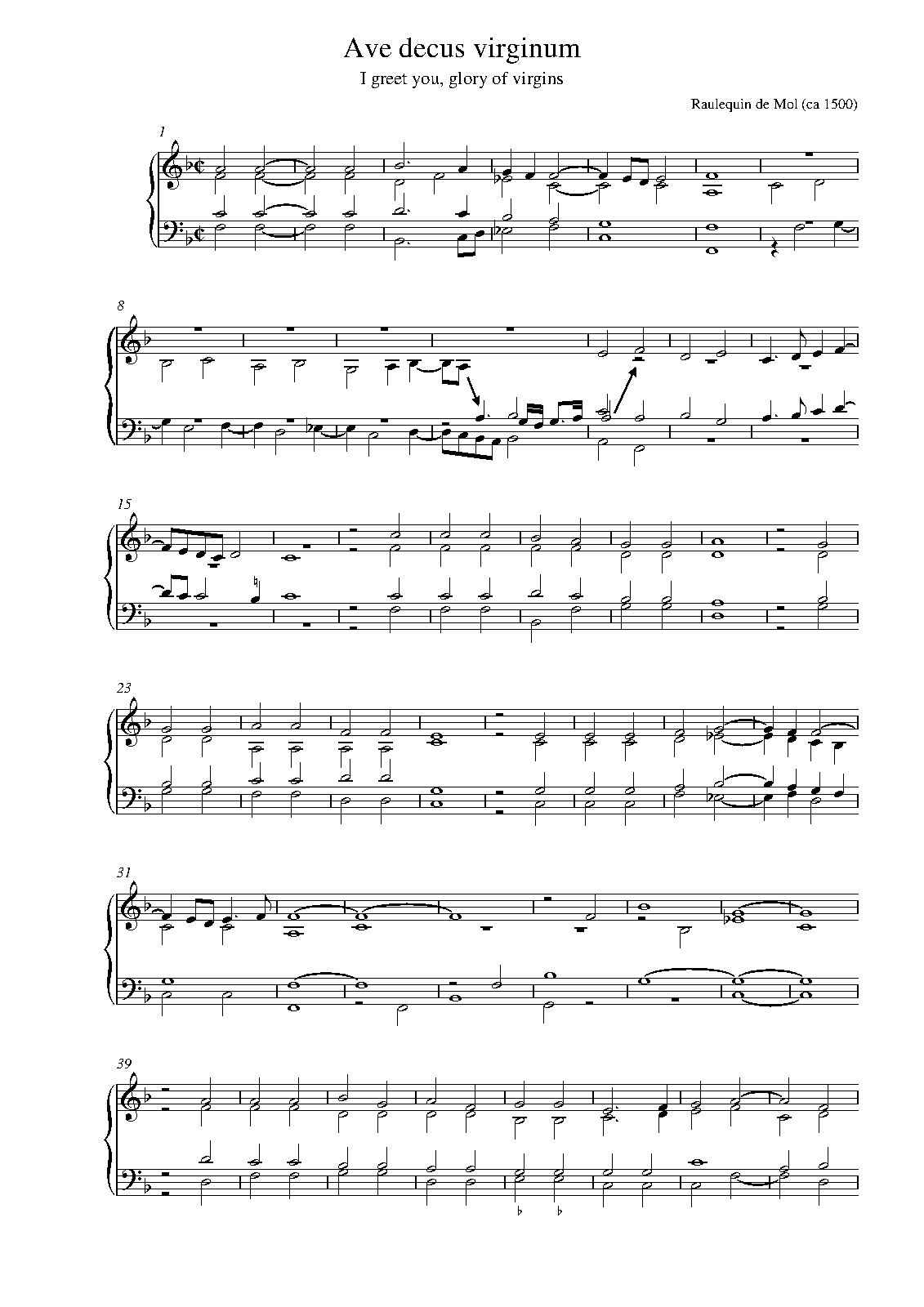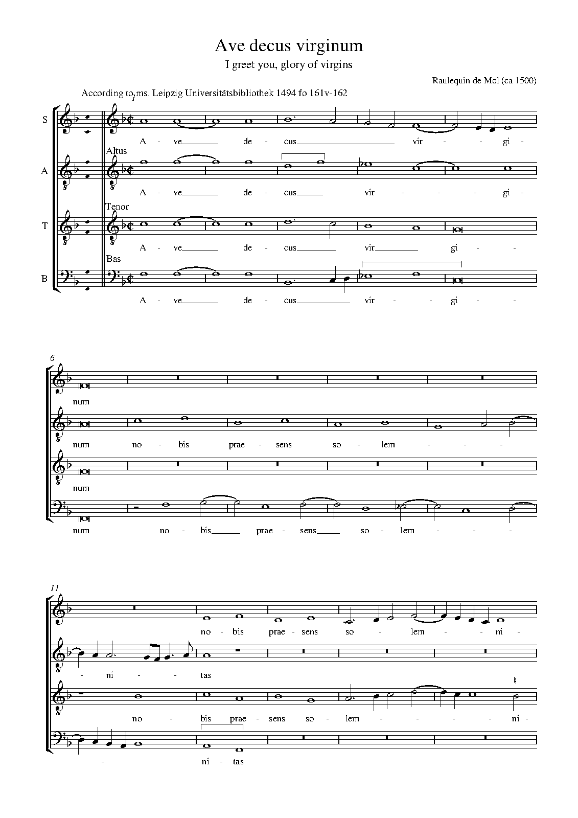 After ms Leipzig Universtity library 1694, dating ca.1490-1506. This is the only known work of this composer, and his origin from Mol, Belgium, is the only known detail of his life. His name is mostly misspelled as Ranlequin. For stylistic reasons and for the lack of a common manuscript tradition it is probable that Roelkin, Raulin and Raulequin were three different composers.