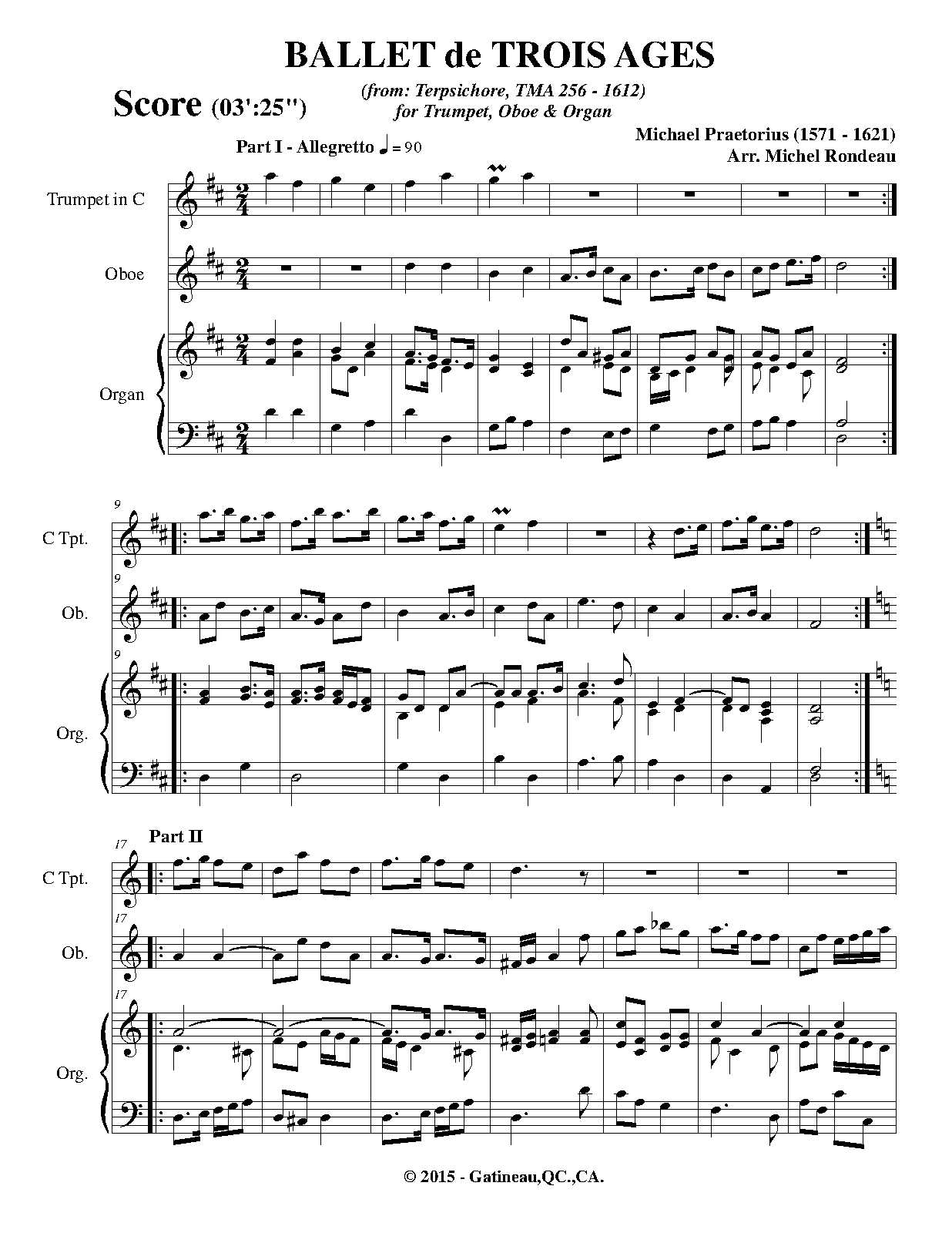 | Extra Information | These pieces were assembled and arranged by Praetorius for his 1612 collection. It is unknown how many, or if any, of the works in the collection were actually composed by Praetorius as opposed to being popular dance tunes arranged by him. The instrumentation is not specified in the original, and simply listed as "à 4". |