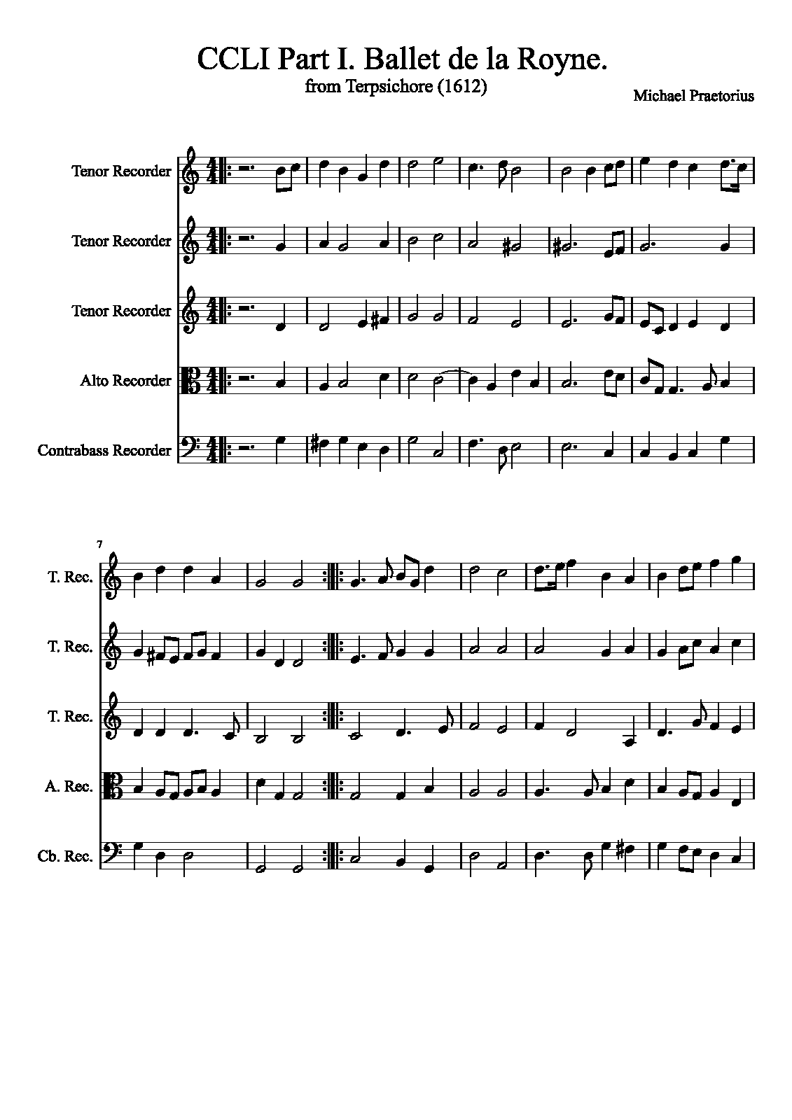| Extra Information | These pieces were assembled and arranged by Praetorius for his 1612 collection. It is unknown how many, or if any, of the works in the collection were actually composed by Praetorius as opposed to being popular dance tunes arranged by him. The instrumentation is not specified in the original, and simply listed as "à 5". |