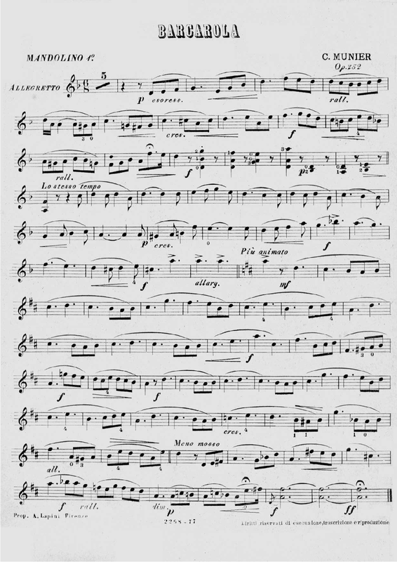 | Genre Categories | Barcarolles; For 2 mandolins, mandola, mandocello, piano; Scores featuring the mandolin; |