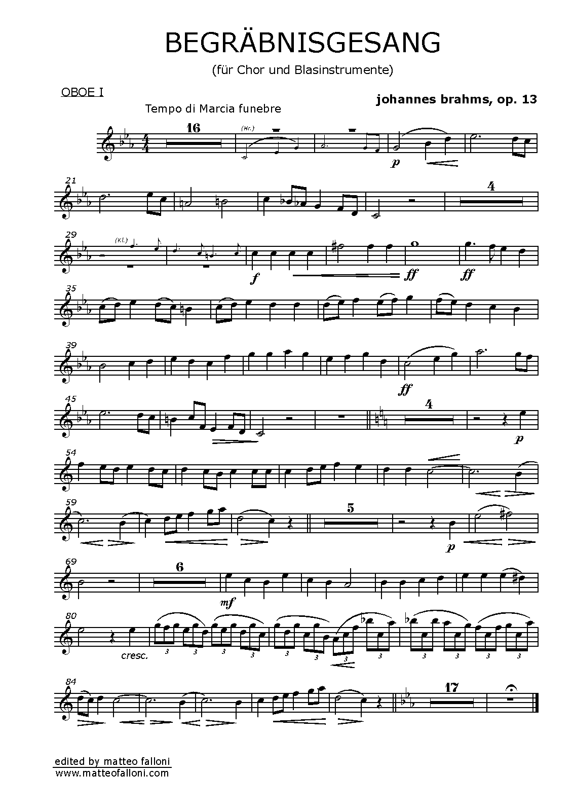| Genre Categories | Songs; Funeral music; For mixed chorus, 2 oboes, 2 clarinets, 2 bassoons, 2 horns, 3 trombones, tuba, timpani; |