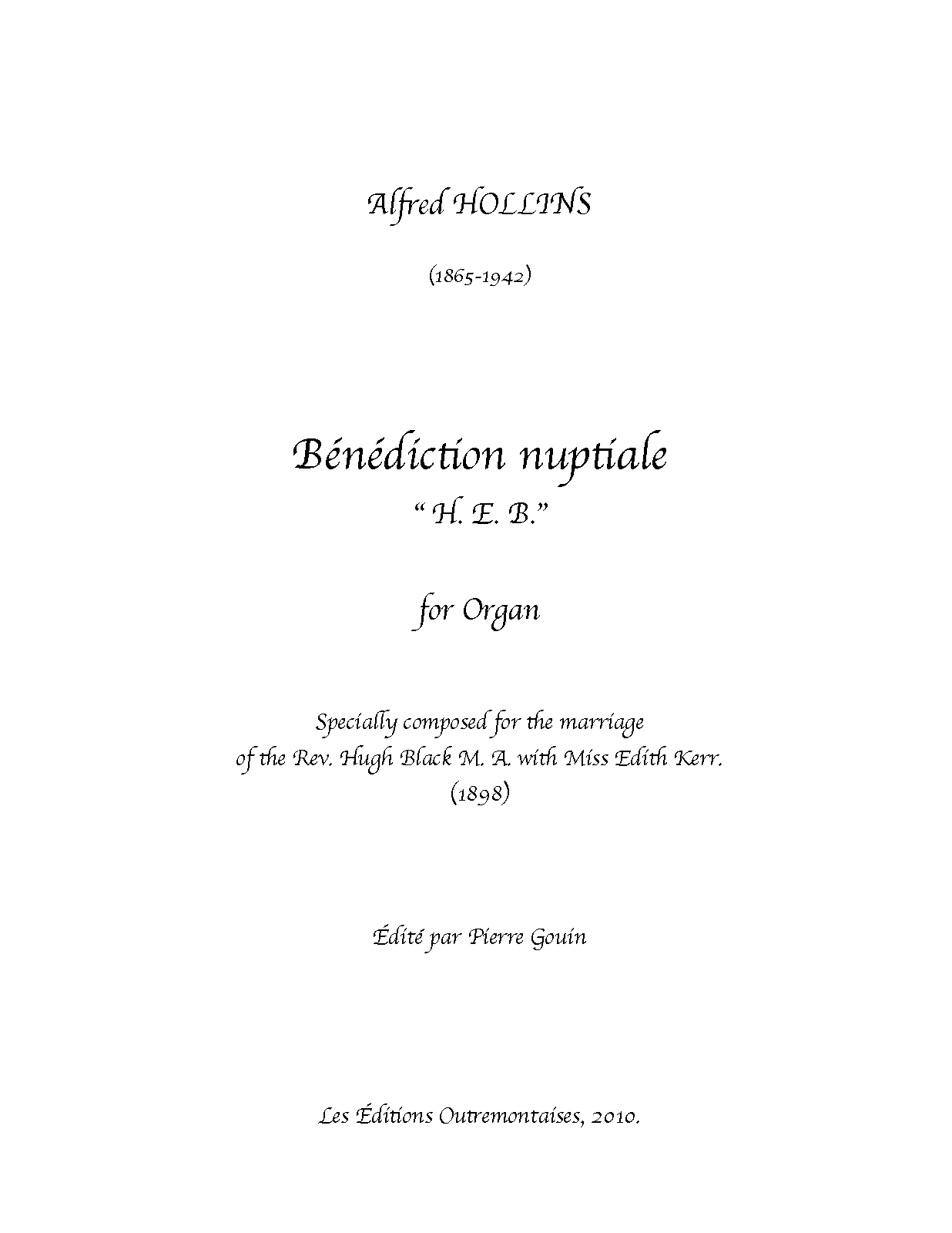| Dedication | Specially composed for the marriage of the Rev. Hugh Black D.D. with Miss Edith Kerr. |
