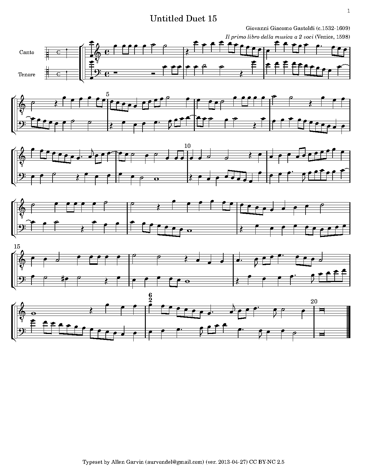 | Extra Information | Il primo libro della musica is the only instrumental work Grove Music lists for Gastoldi. It is comprised entirely of music for 2 voices, though the instrumentation is left unspecified. It contains 38 untexted bicinia, the first 20 of which are by Gastoldi. |