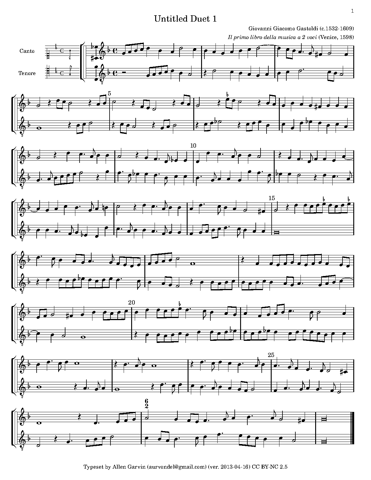 | Extra Information | Il primo libro della musica is the only instrumental work Grove Music lists for Gastoldi. It is comprised entirely of music for 2 voices, though the instrumentation is left unspecified. It contains 38 untexted bicinia, the first 20 of which are by Gastoldi. |