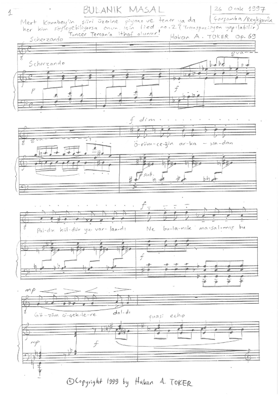 Subtitle in the first page translates: Lied no. 2 for tenor -or whoever can sing it- and piano on a poem by Mert Karabey. (Transposition is allowed)