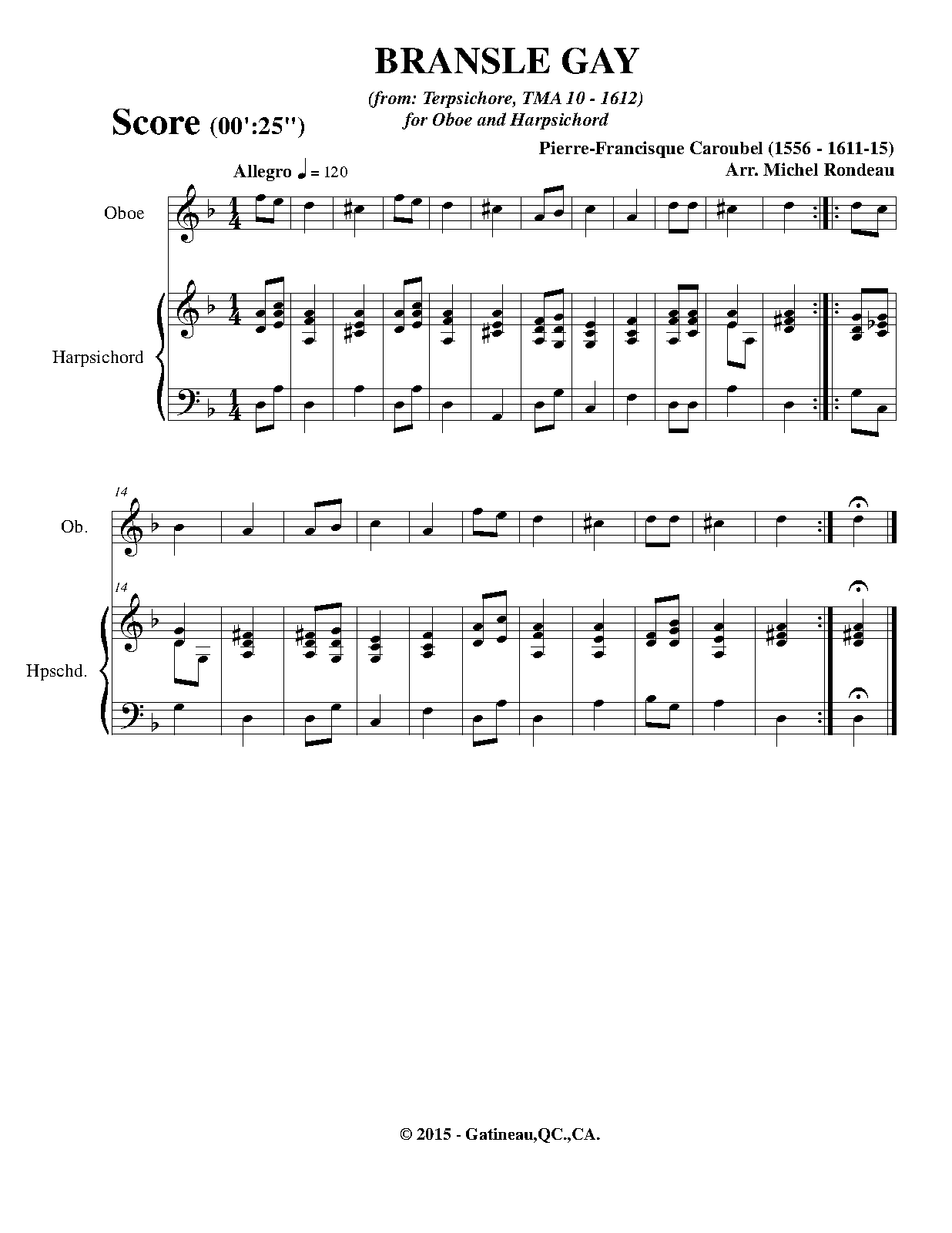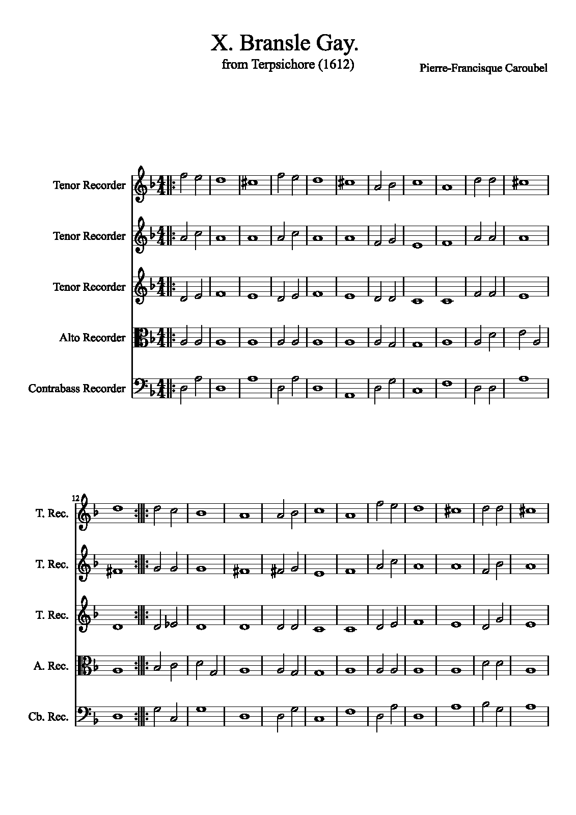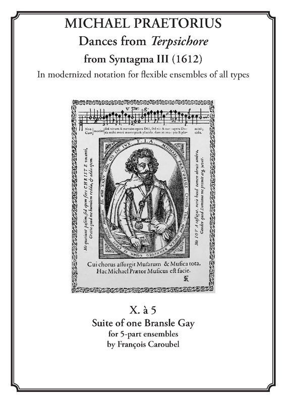 These pieces were assembled and arranged by Praetorius for his 1612 collection. It is unknown how many, or if any, of the works in the collection were actually composed by Caroubel as opposed to being popular dance tunes arranged by him. The instrumentation is not specified in the original, and simply listed as "à 5"