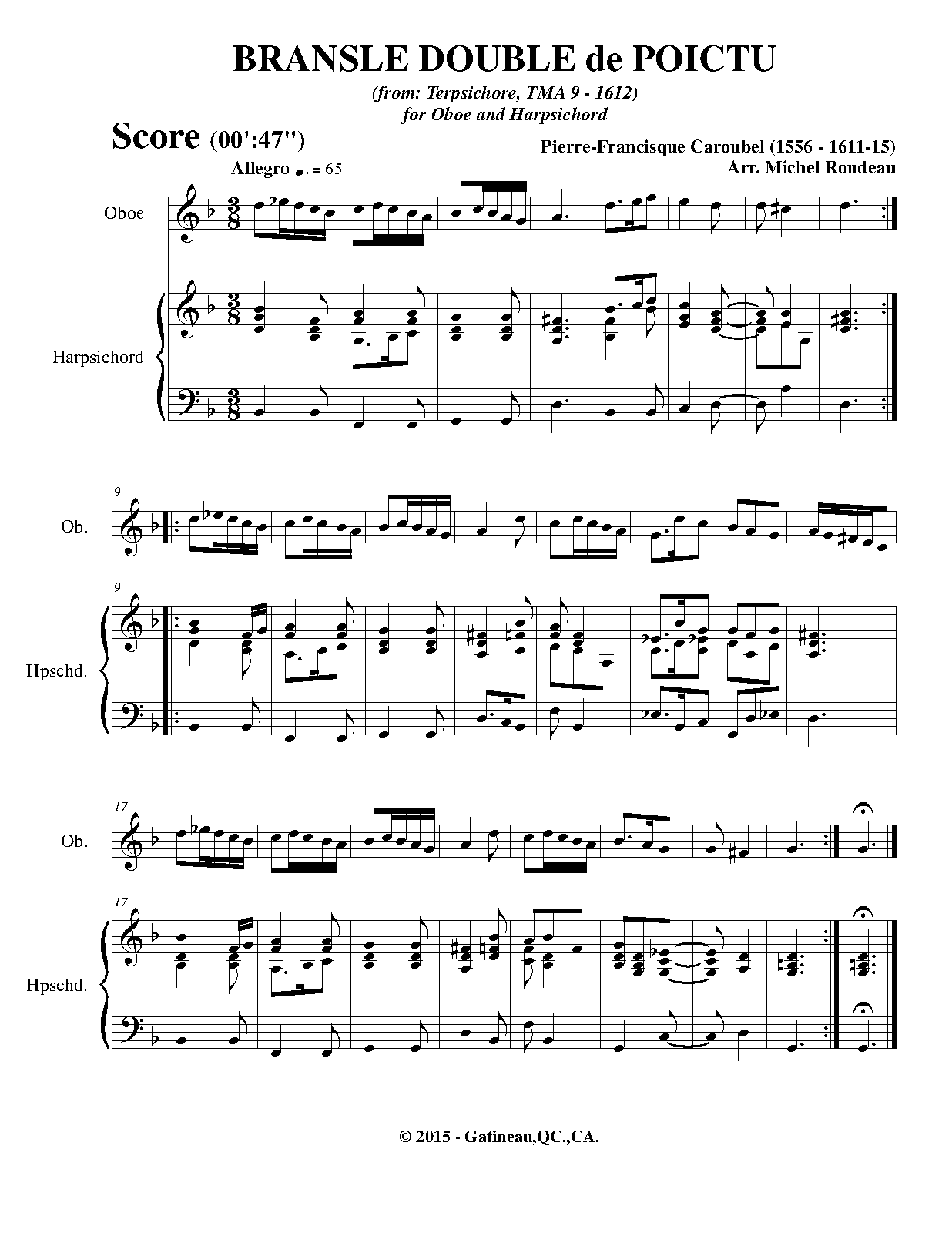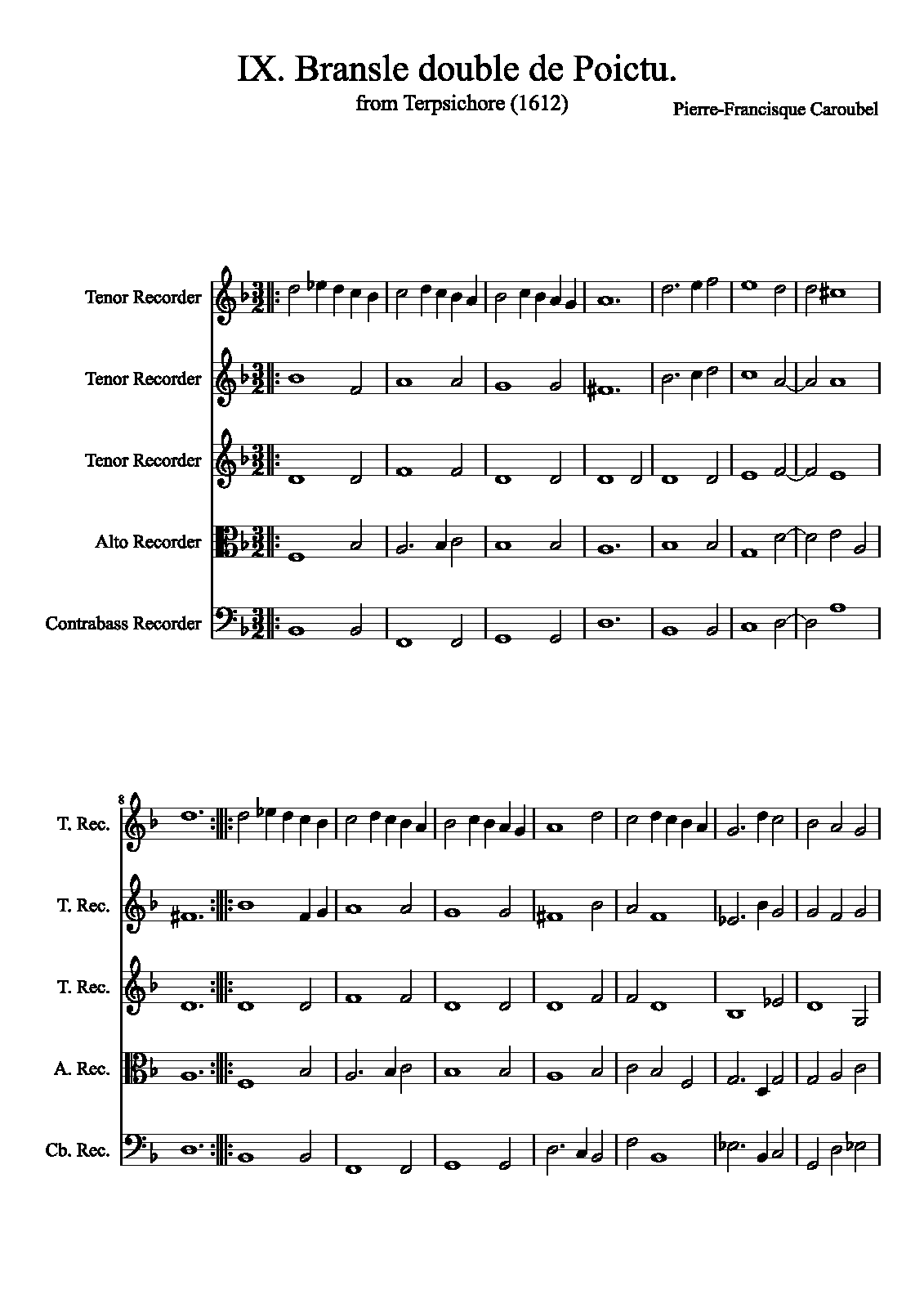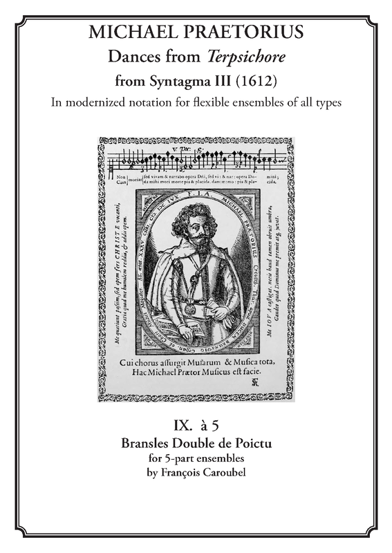 These pieces were assembled and arranged by Praetorius for his 1612 collection. It is unknown how many, or if any, of the works in the collection were actually composed by Caroubel as opposed to being popular dance tunes arranged by him. The instrumentation is not specified in the original, and simply listed as "à 5"