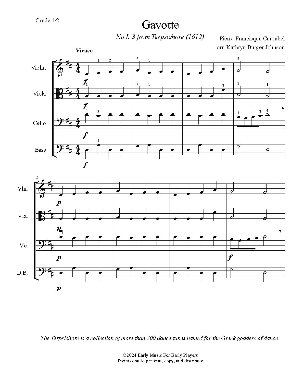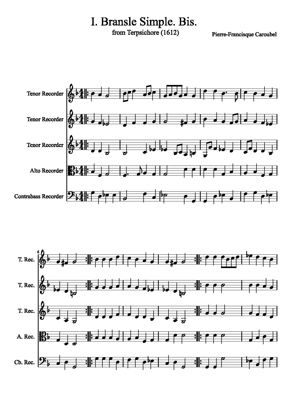 | Extra Information | These pieces were assembled and arranged by Praetorius for his 1612 collection. It is unknown how many, or if any, of the works in the collection were actually composed by Caroubel as opposed to being popular dance tunes arranged by him. The instrumentation is not specified in the original, and simply listed as "à 5" |