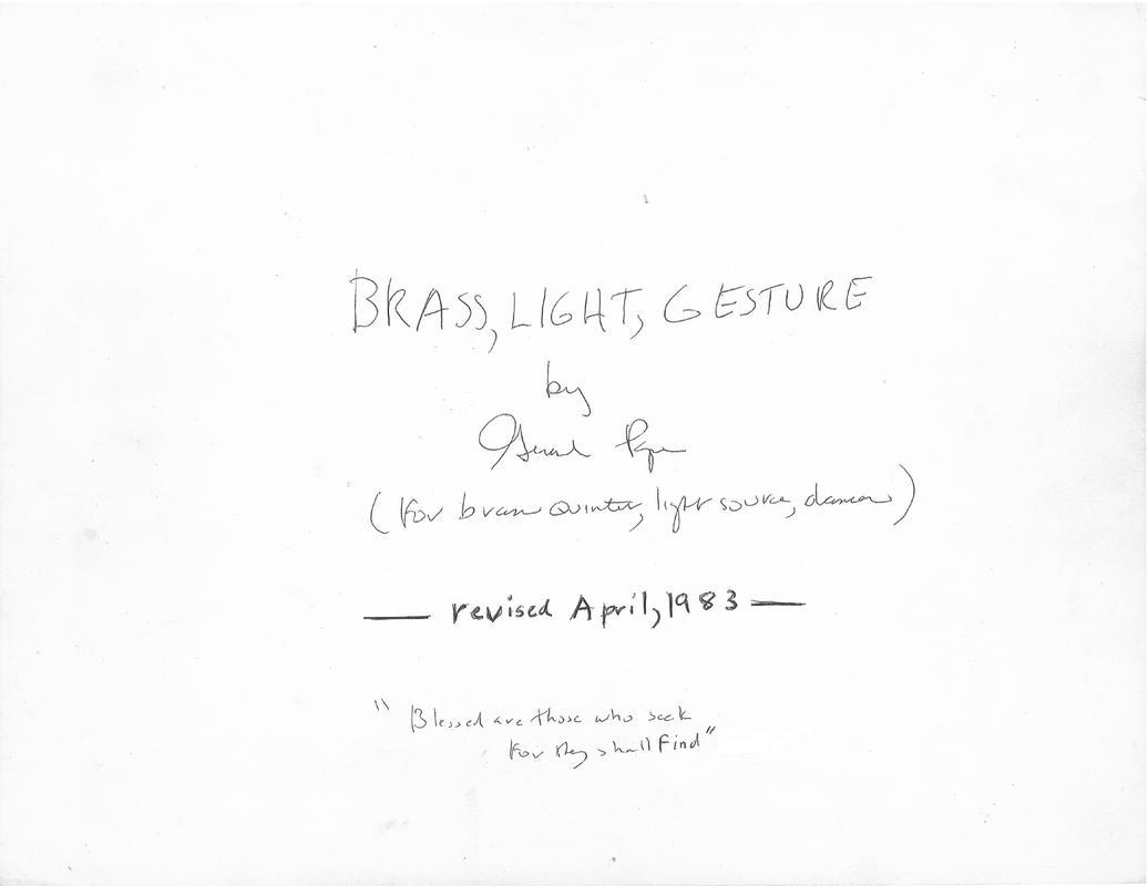 Brass, Light, Gesture was originally written in 1983 for brass quintet, light performer and gesturer.