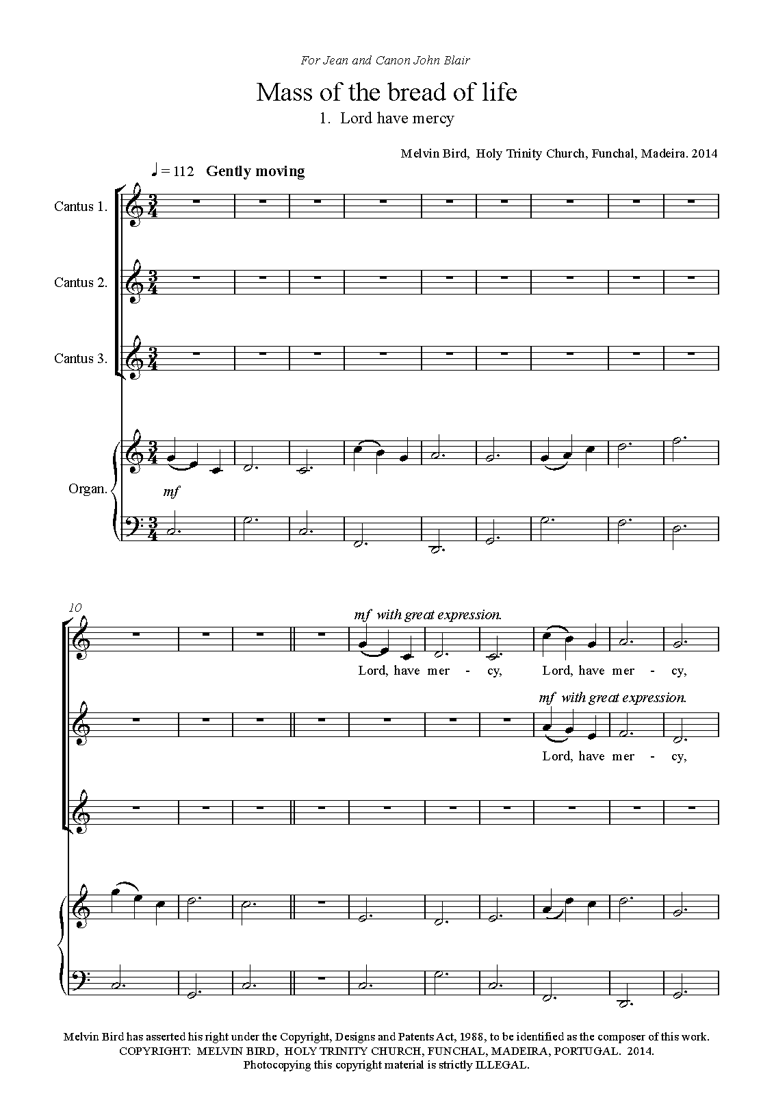 Melvin Bird has asserted his right under the Copyright, Designs and Patents Act, 1988, to be identified as the composer of this work. Please contact the composer for further information. The composer welcomes any performances and recordings. melvin.bird@hotmail.com. A clear and clean text.