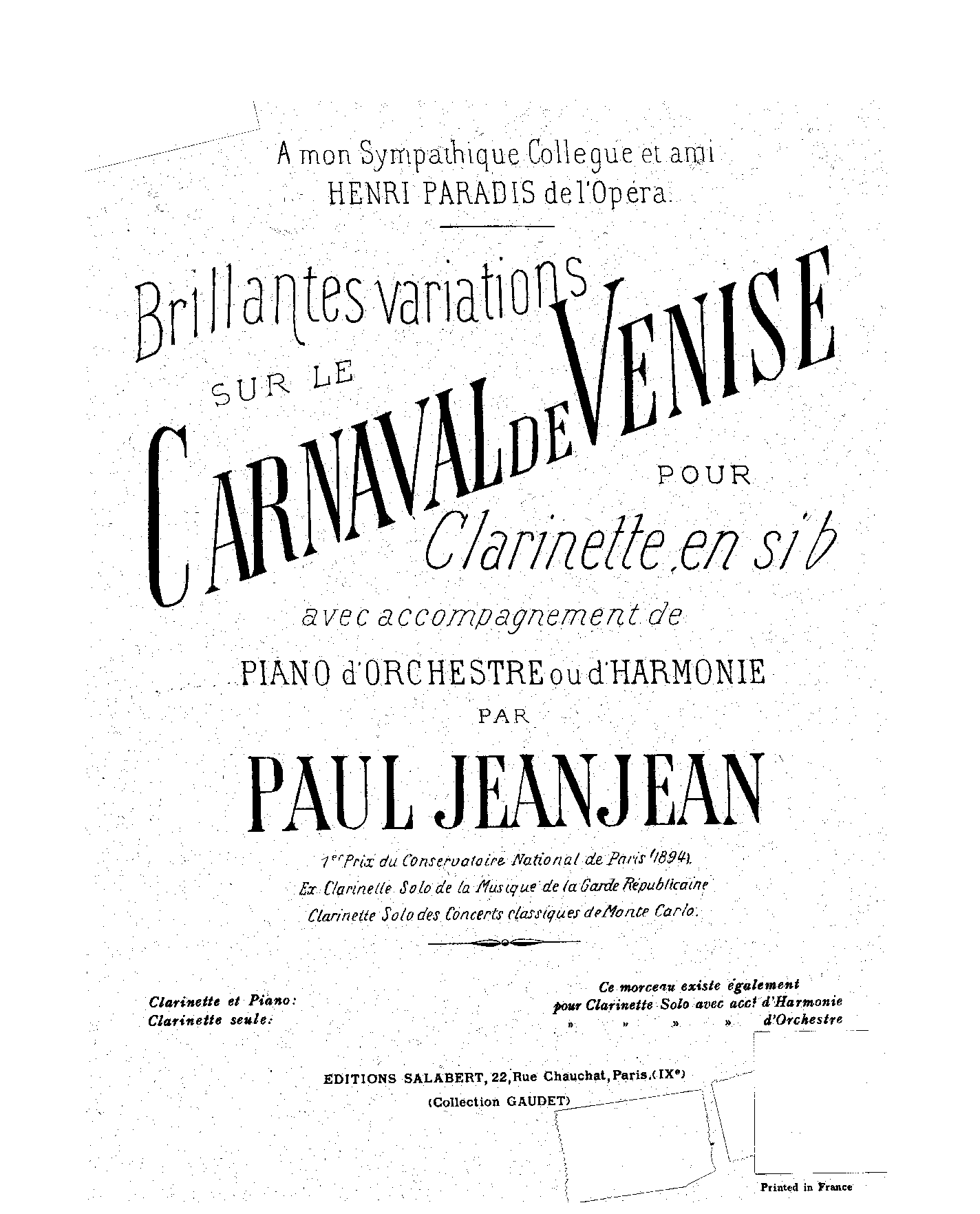| Dedication | à mon sympathique collègue et ami Henri Paradis de l'Opéra |