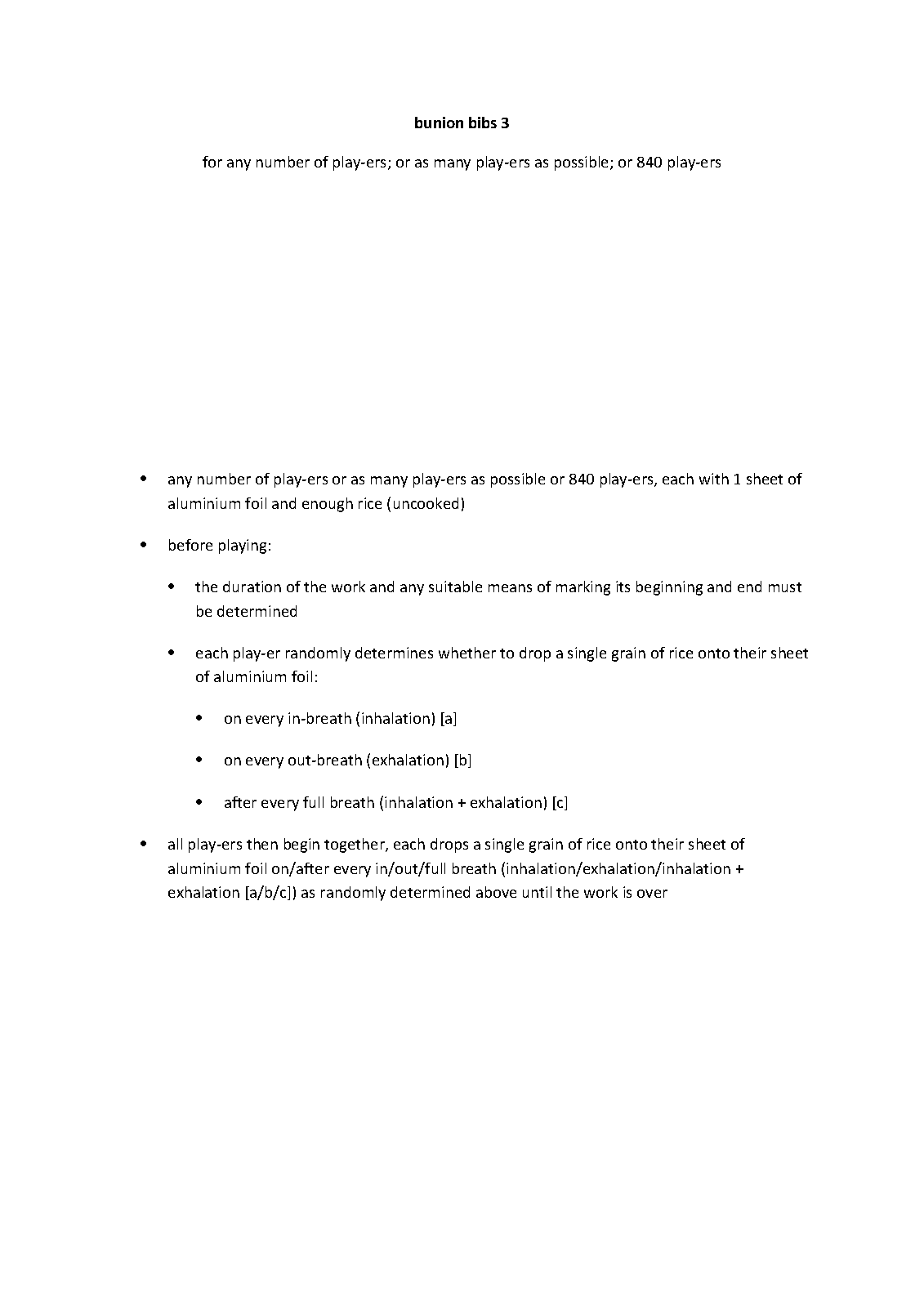 | Instrumentation | any number of play-ers or as many play-ers as possible or 840 play-ers, each with 1 sheet of aluminium foil and enough rice (uncooked) |