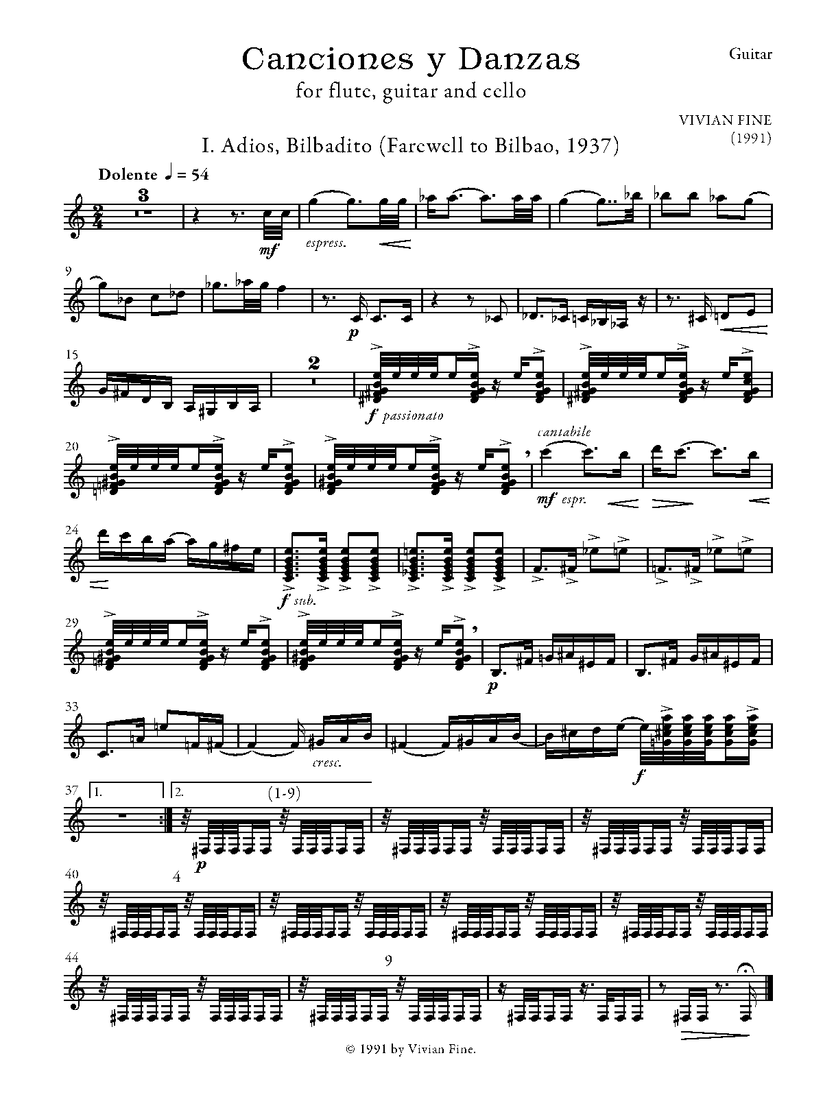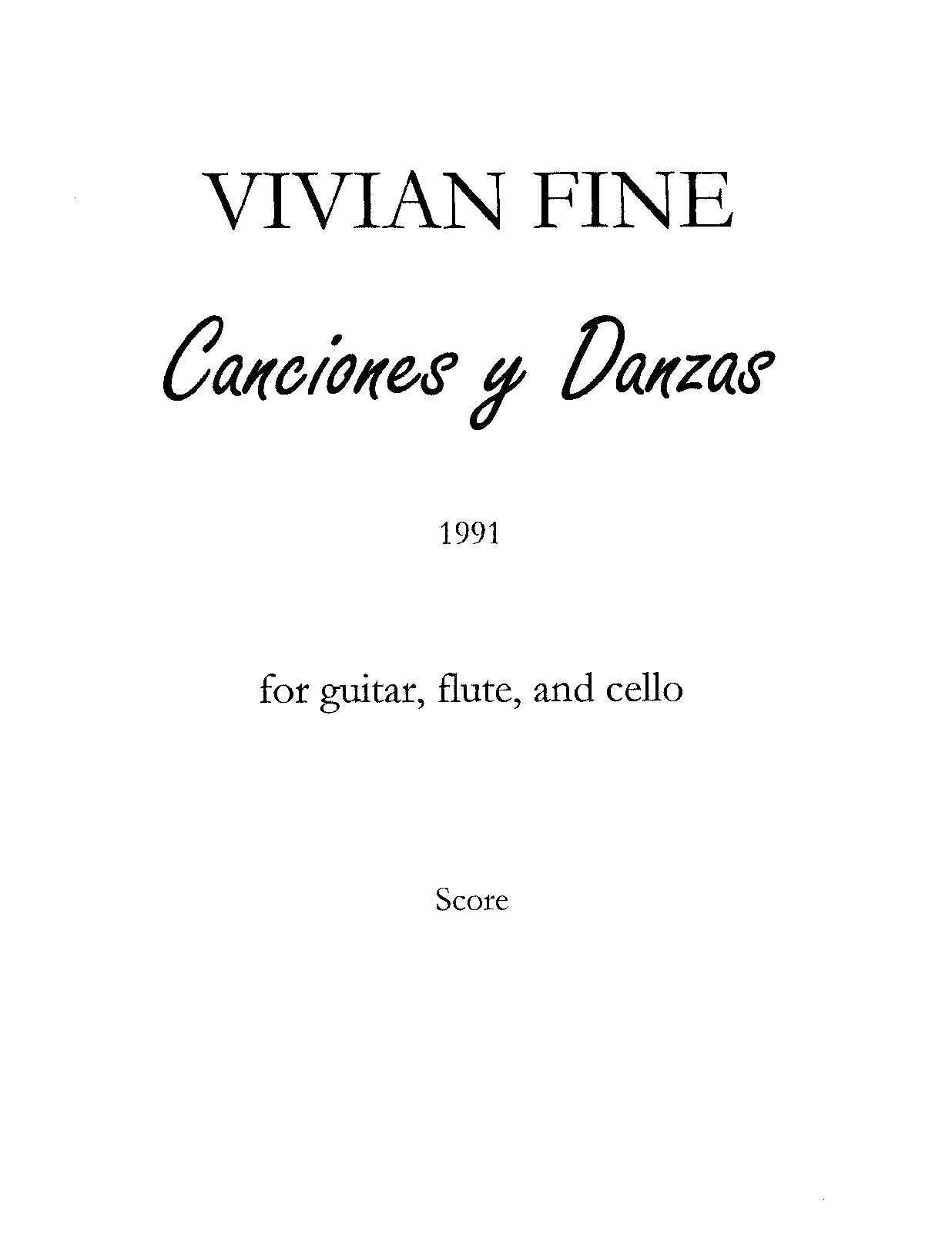 All five works on the disc are major pieces, perhaps the most successful, Vivian Fine’s five-part Canciones y Danzas. Fine’s songs and dances exploit the guitar in an original way, getting inside the Spanish sensibility for the play of darkness and light. The opening piece—“Adios Bilbadito” (Farewell to Bilbao)—refers to the destructions of a village during the Spanish Civil War. It starts out fairly simply with a little tune on the guitar and ends with screams from the flute and laments from the cello....