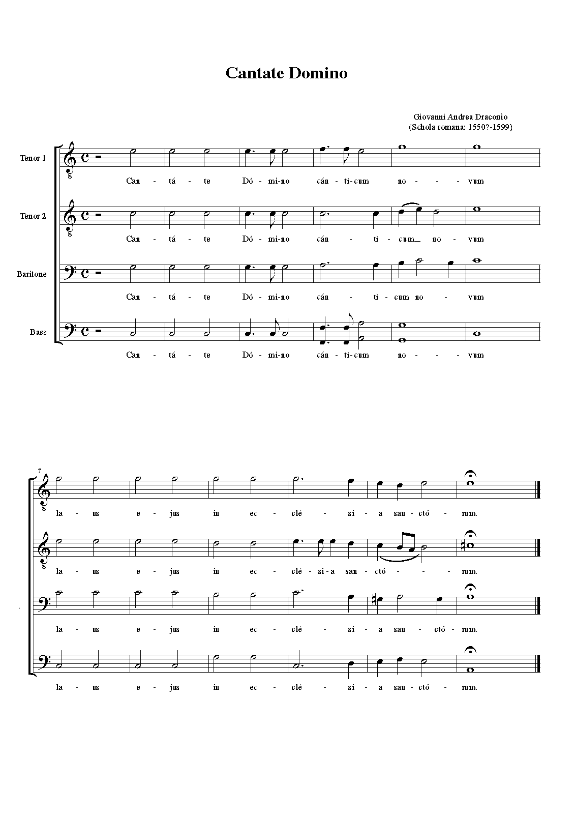 Source (or collection) is not listed, nor is this work in RISM. However, this is tagged as a motet, on the basis that according to Wikipedia, much of his sacred music was lost, but one volume of motets survives, which RISM lists as being for 5 voices. Tagging is subject to correction should this collection not contain Cantate Domino.