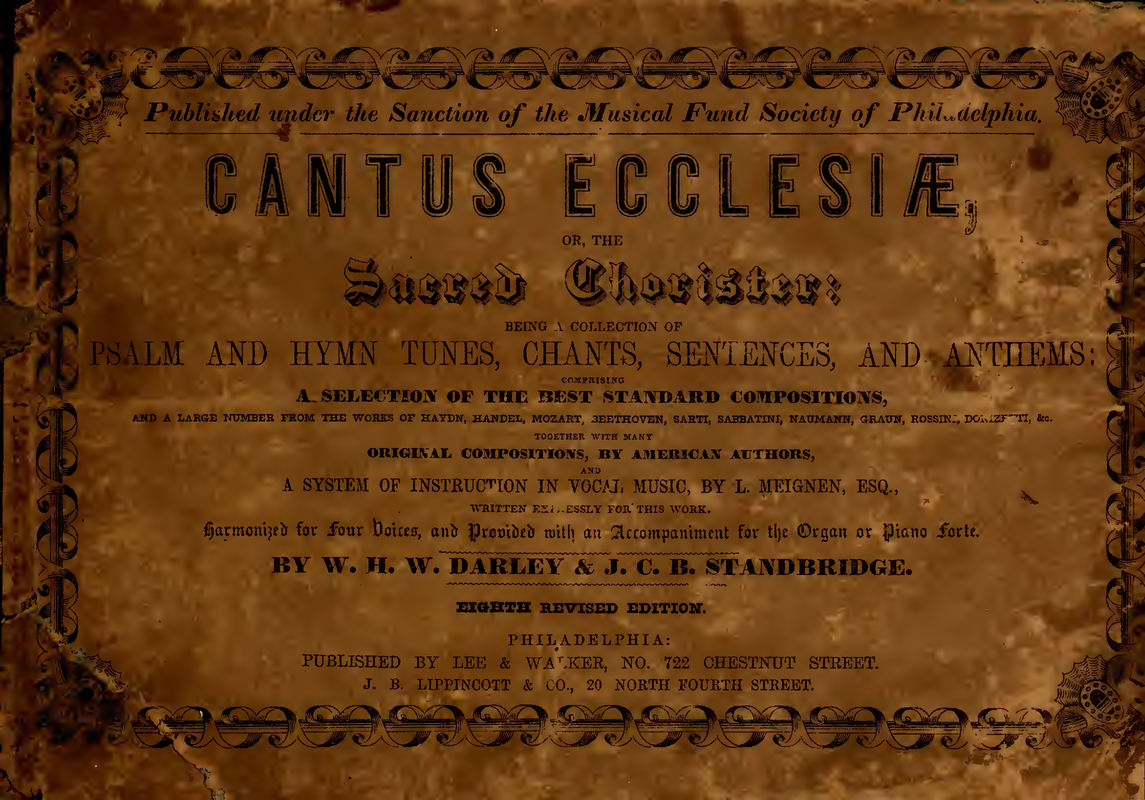 Cantus Ecclesiæ, or, the Sacred Chorister: being a collection of psalm and hymn tunes, chants, sentences, and anthems: comprising a selection of the best standard compositions, and a large number form the works of Haydn, Handel, Mozart, Beethoven, Sarti, Sabbatini, Naumann, Graun, Rossini, Donizetti, &c. together with many original compositions, by American authors, and a system of instruction in vocal music, by L. Meignen, Esq., written expressly for this work. Harmonized for Four Voices, and Provided with an Accompaniment for the Organ or Piano Forte. By W. H. W. Darley & J. C. B. Standbridge.