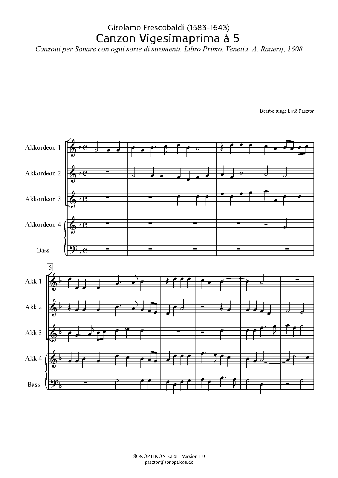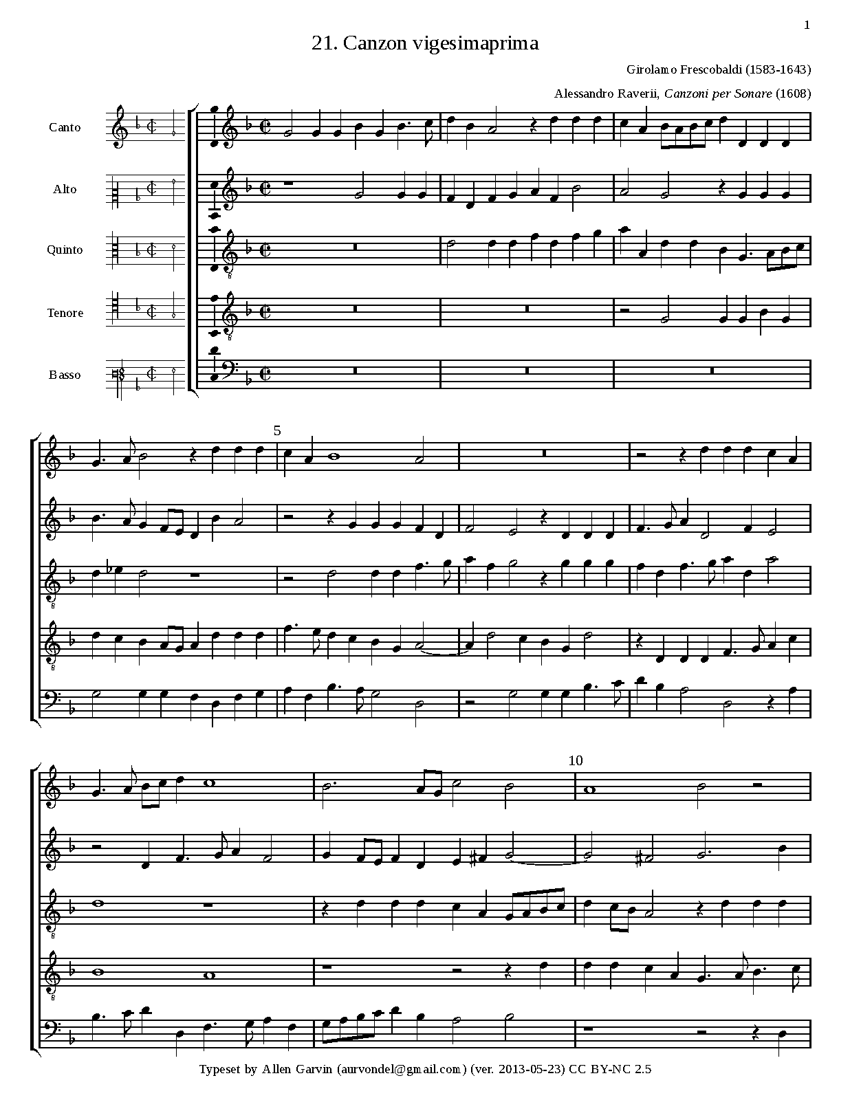 ⇒ 12 more: Complete score, G clef notation • Canto • Alto, C clef notation • Alto, G clef notation • Quinto, C clef notation • Quinto, G clef notation • Tenore, C clef notation • Tenore, G clef notation • Basso • Basso generale per L'Organo • Engraving files (Finale) • Engraving files (MusicXML)