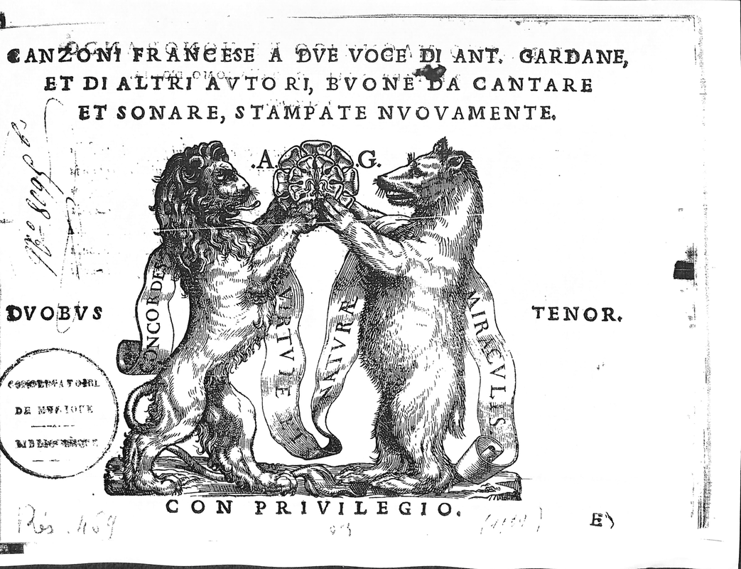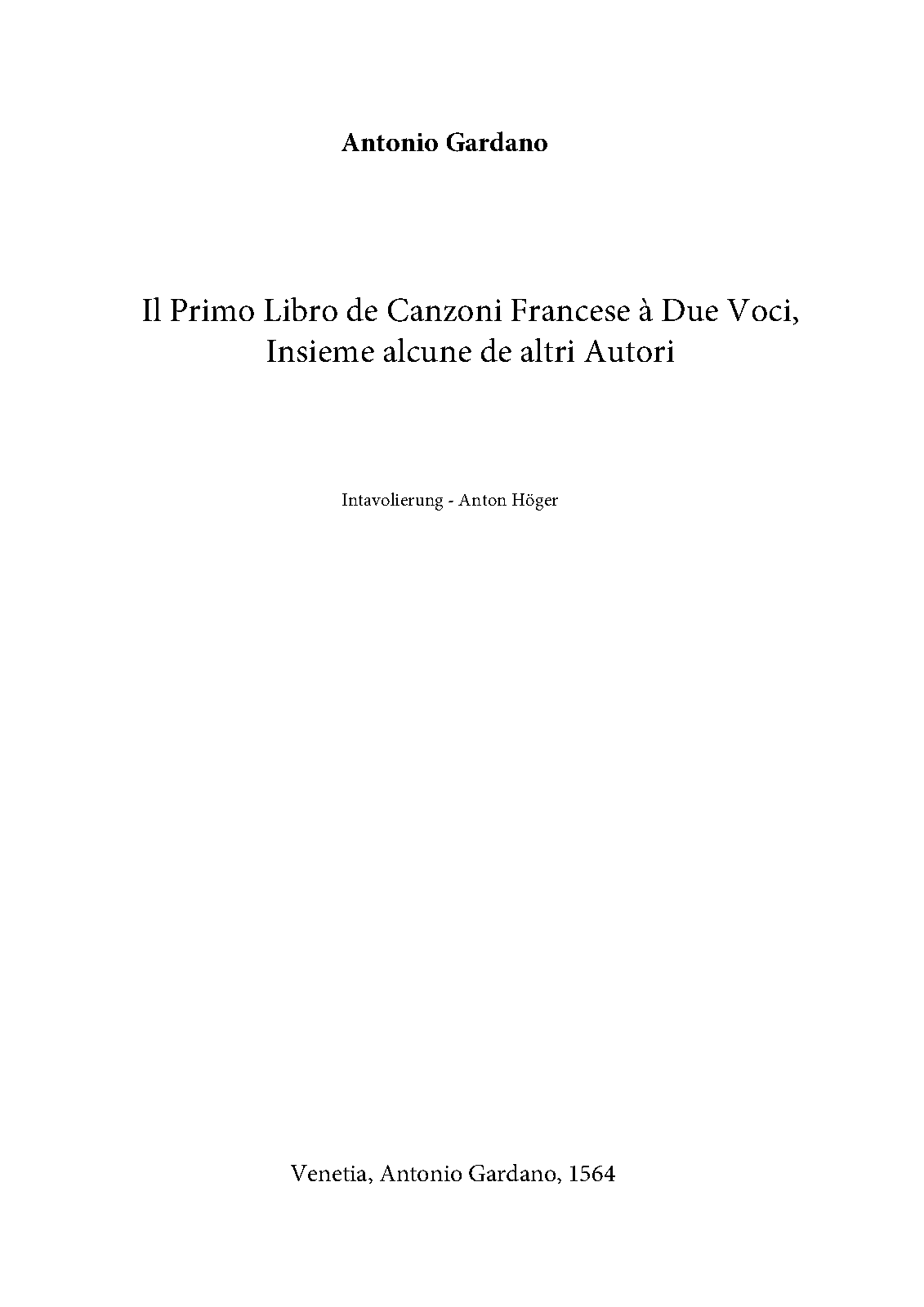 | Alternative. Title | Canzoni francese a due voci di Ant. Gardane, et di altri autori, buone da cantare et sonare, stampate nuovamente / Canzoni francese a due voci d'Antonio Gardane insieme alcuni de altri autori, libro primo. |