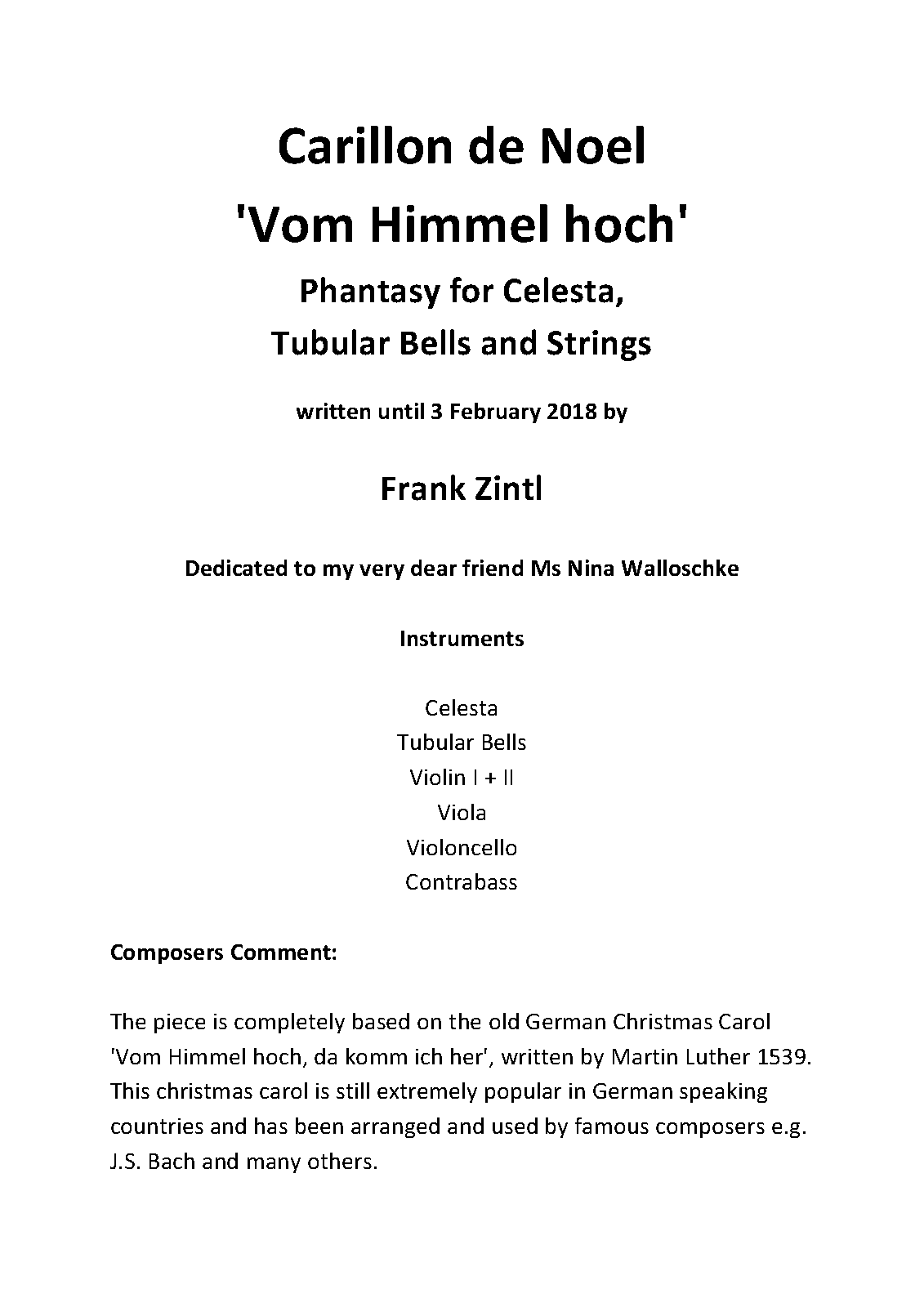 This work is based on the famous and very popular German Christmas Carol 'Vom Himmel hoch', written by Martin Luther 1539. Many composer, even famous people like J.S. Bach, have frequently used this carol since then.