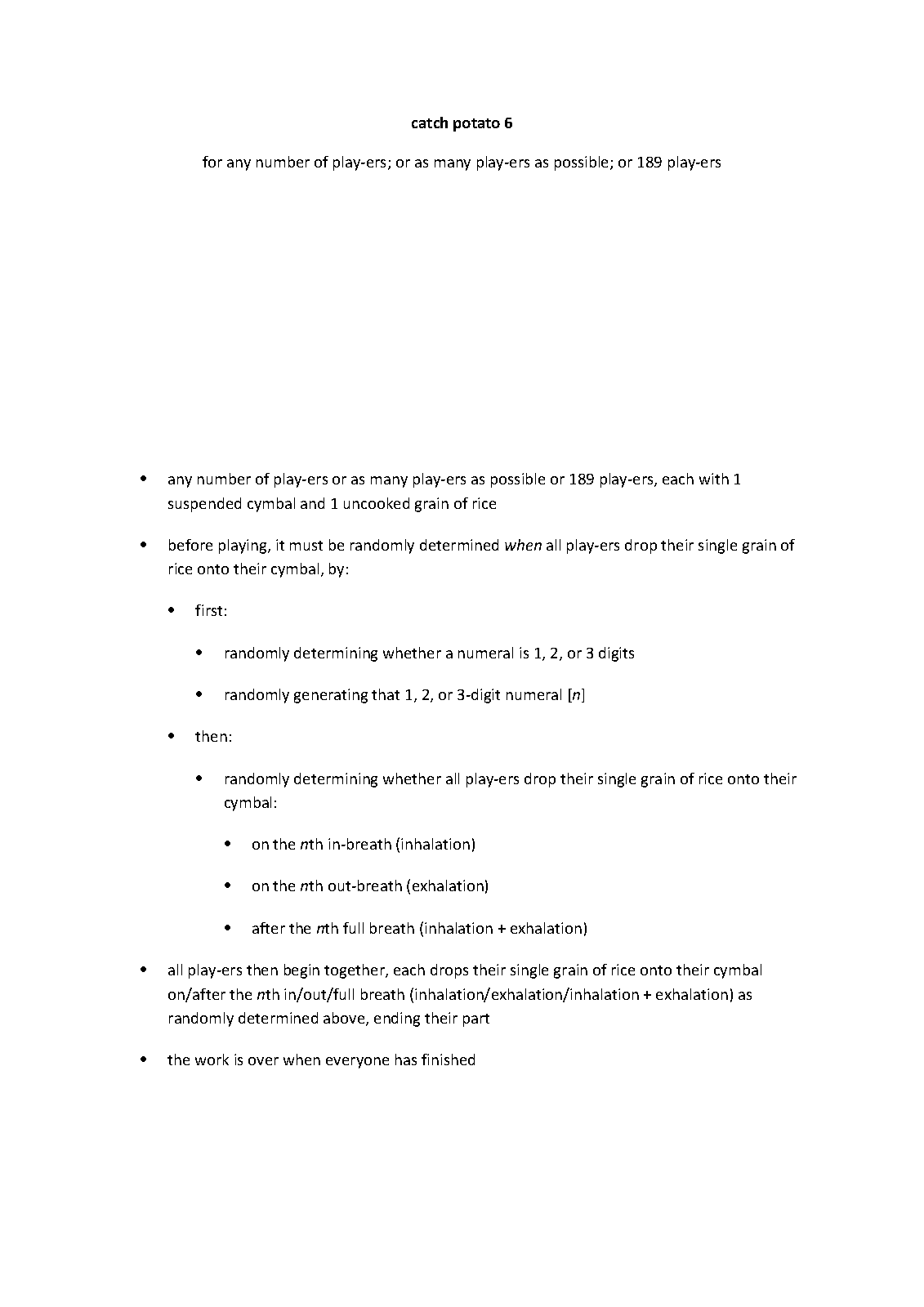 | Instrumentation | any number of play-ers or as many play-ers as possible or 189 play-ers, each with 1 suspended cymbal and 1 uncooked grain of rice |
