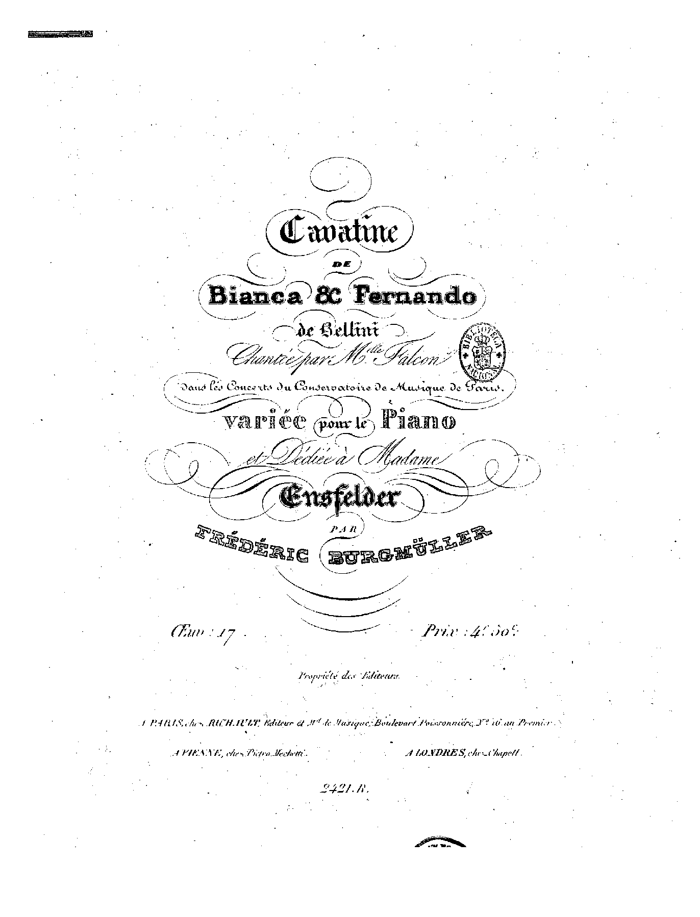 | Alternative. Title | Cavatine de Bianca & Fernando de Bellini variée pour le piano ; Alla gioia ed al piacer |