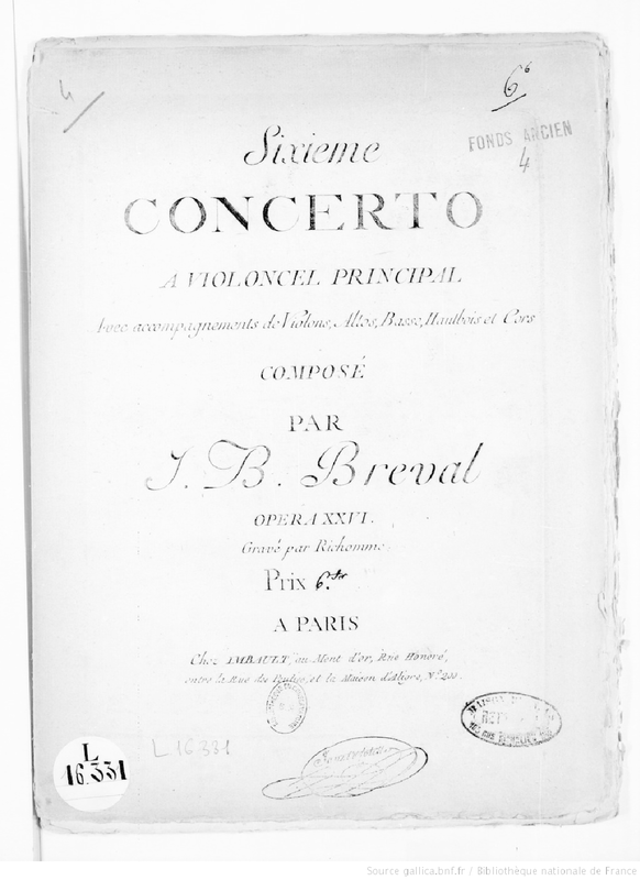 | Alternative. Title | Sixième Concerto a Violoncel Principal, avec accompagnements de Violons, Altos, Basse, Hautbois [ou flutes] et Cors |