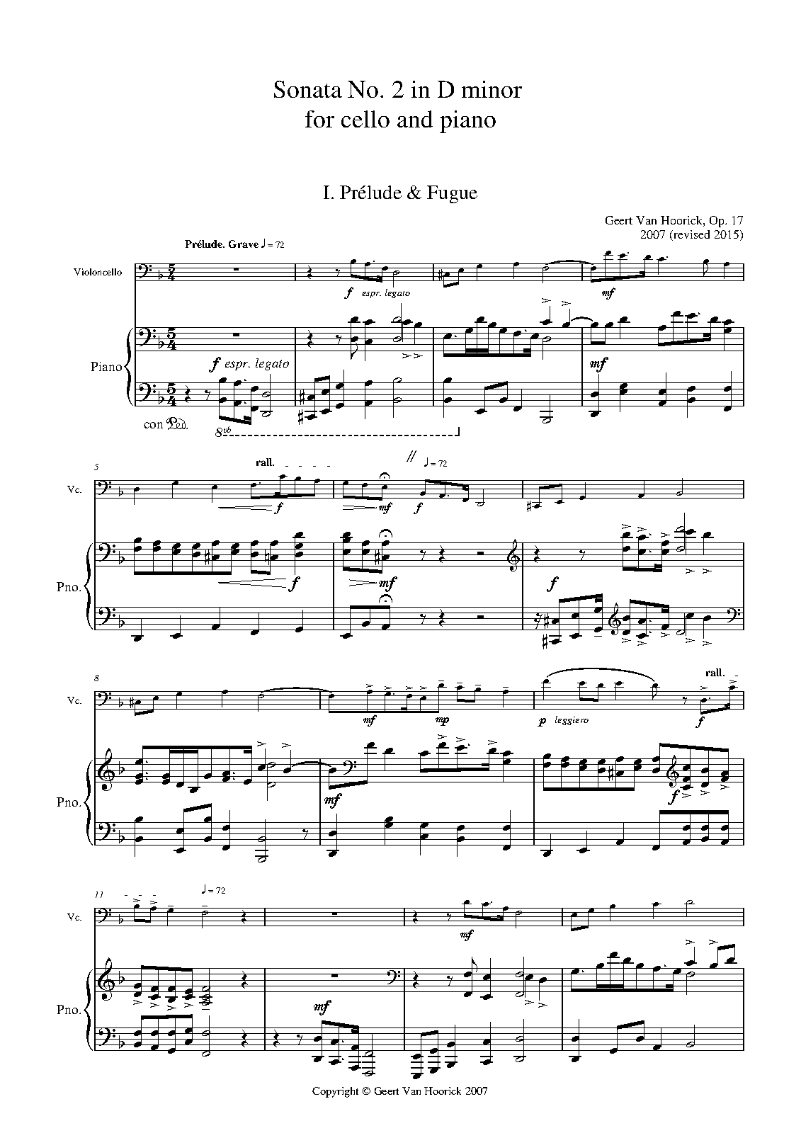 The 2nd cello sonata is neo-romantic. The 1st movement is in AB form, is moderately fast, and consists of a prelude and a fugue. The 2nd movement is also in AB form, is slow, and consists of an air and a choral. The final movement is fast and in rondo form. The revision of 2015 improved the playability of the piece. The digital performance is based on a recording (of an earlier version) in Sibelius 4 with Kontakt Player Gold. Videos with the score moving and play along videos are on my YouTube-channel.