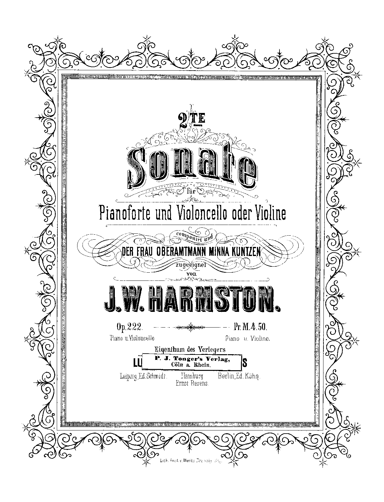 Original images: ca.300dpi, color tif (from pdf) files approx. 3080 by 3960 pixels. Editing: re-sampled to 600dpi, converted to black and white tif files, de-skewed, and set uniform margins. Tonger acquired the publisher Adolph Berens before the work was published. Note the Tonger label on the cover. The score is from the estate of Joseph Joachim.