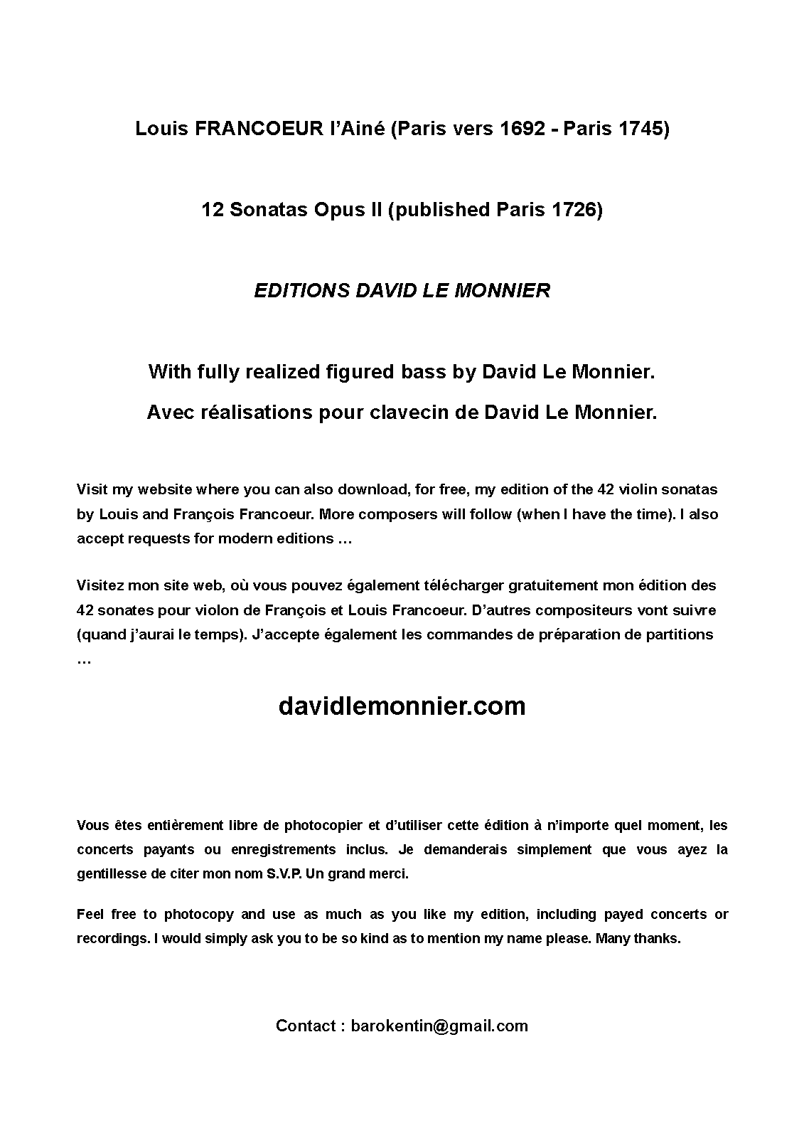 | Alternative. Title | IIme. Livre de sonates a violon seul et basse continüe ... composez par Mr. Francœur le Fils aisné |