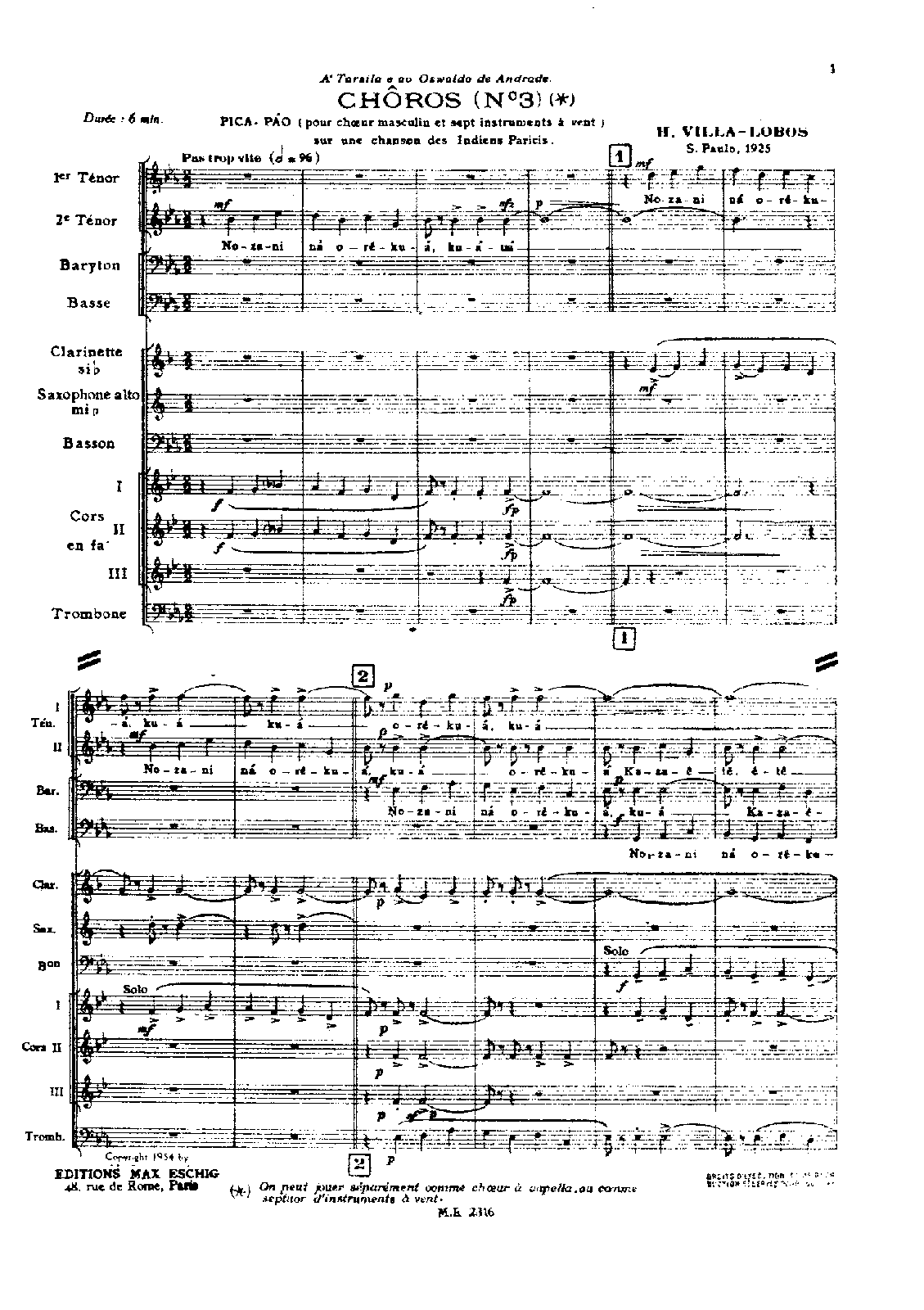 Inscribed as 'Dedicated to the sonorous atmosphere of the primitive music of the aborigines of the states of Matto Grosso and Goias'. Based on the theme 'Nozani-ná' from the Pareci Indians (as collected by Edgar Roquette-Pinto, from Mato Grosso, see Canções típicas brasileiras, W158).
