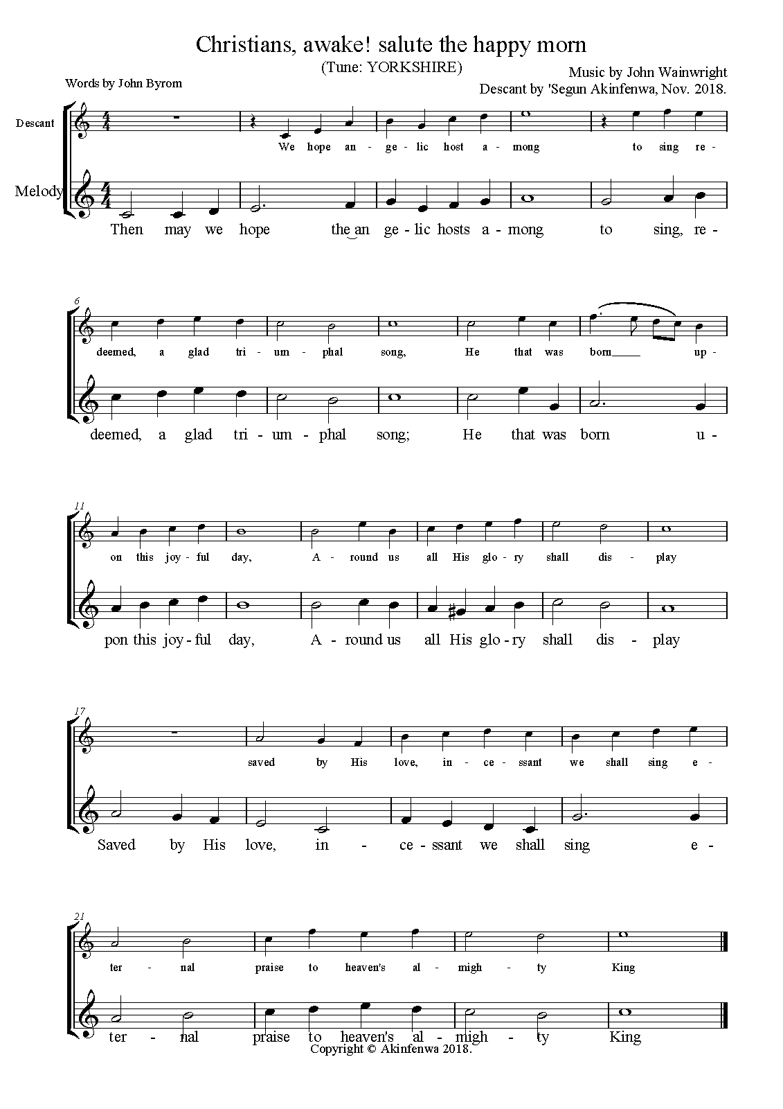 | Work Title | Christians, awake! salute the happy morn hymn descant |