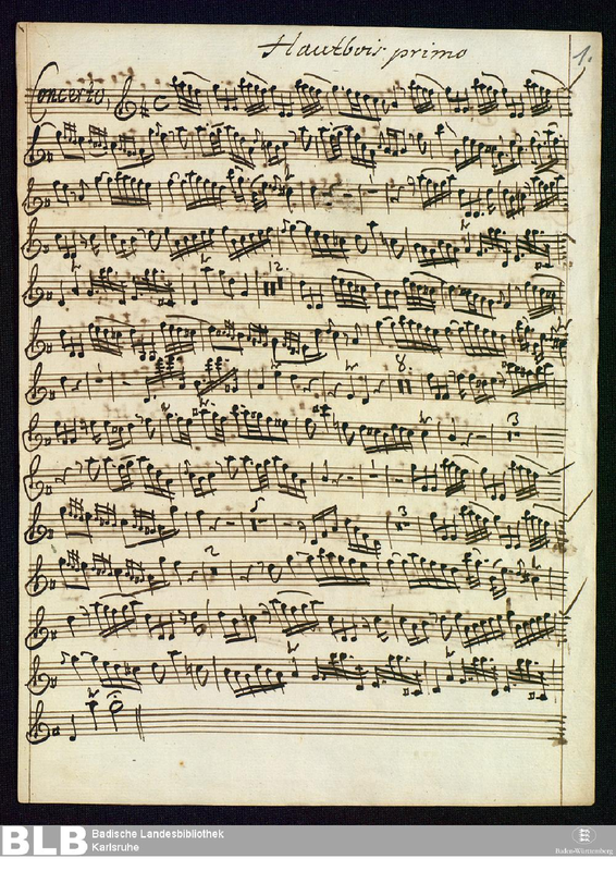 Badische Landesbibliothek, Karlsruhe (D-KA): Mus.Hs.302 The 2 oboe parts are not entered into the score. 120 dpi color scans. Higher resolution color scans (300 dpi, only screen display) can be found at DKA