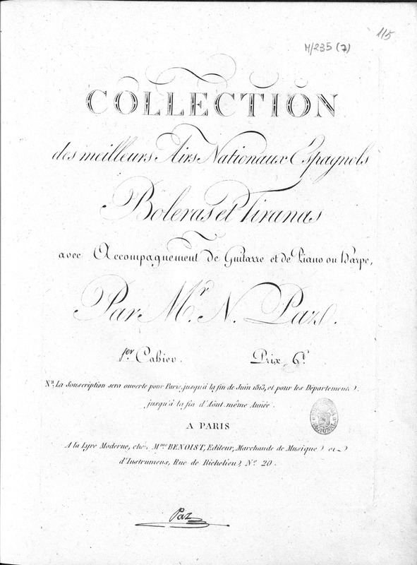 | Alternative. Title | Collection des meilleurs Airs Nationaux Espagnols, Boleras et Tiranas avec accompagnement de Guitare et de Piano ou Harpe |