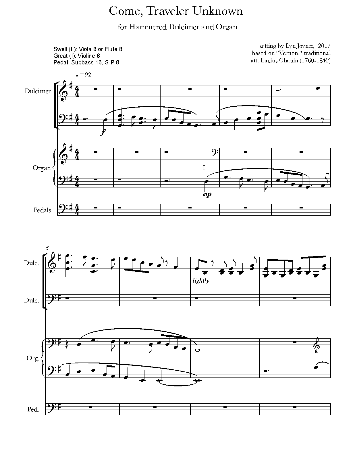 | Work Title | Come, Traveler Unknown-for Hammered Dulcimer and Organ |