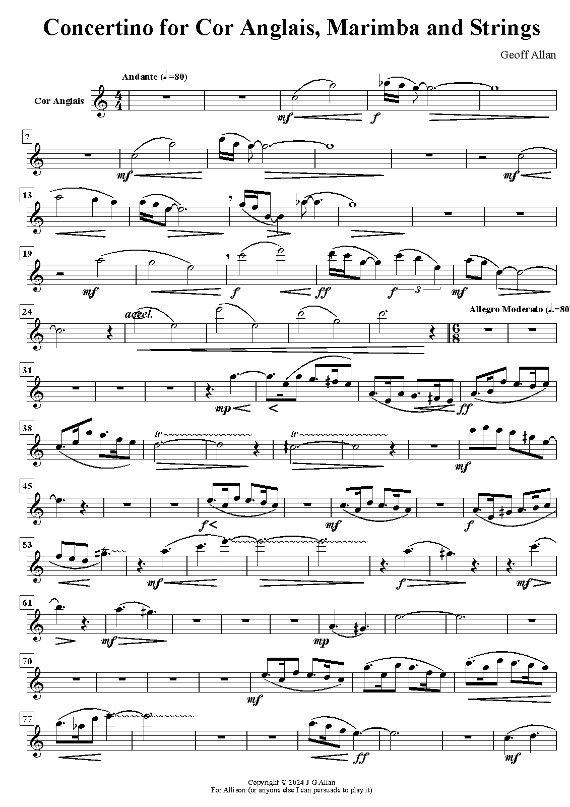 | Extra Information | Alternative Keyboard part if Marimba not available. Written in the New Year of 2024 mainly because I like the sound of the Cor Anglais. The Marimba is added as contrast in sound. I apologise to the strings for the repetitive Rumba section !). If a Marimba is not available, please use the other version where the part can be played on a piano or a keyboard (with Marimba sound if required). The concertino is short (about 12.5 mins) and is basically light classical in style. It is in a single movement with several sections. The “Swans on a River” section theme was written against a poem (Swan Creek by Williston Fish). (I have a slight synaesthesia between words and music). |