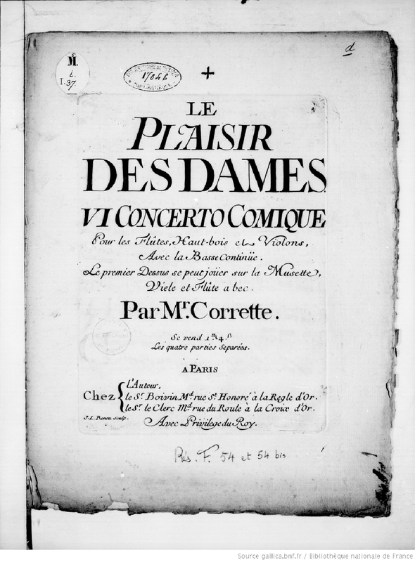 Le Plaisir des dames VI Concerto Comique pour les Flutes, Haut-bois et Violons, avec la basse continue. Le premier dessus se peut jouer sur la musette, viele et flute a bec