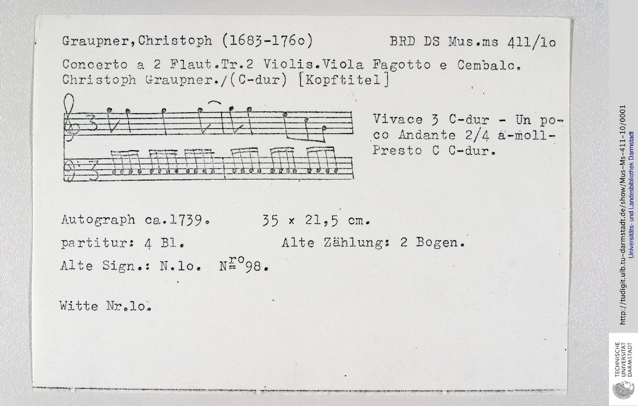 | Alternative. Title | Concerto a 2 Flaut. Tr. 2 Violis. Viola Fagotto e Cembalo. |