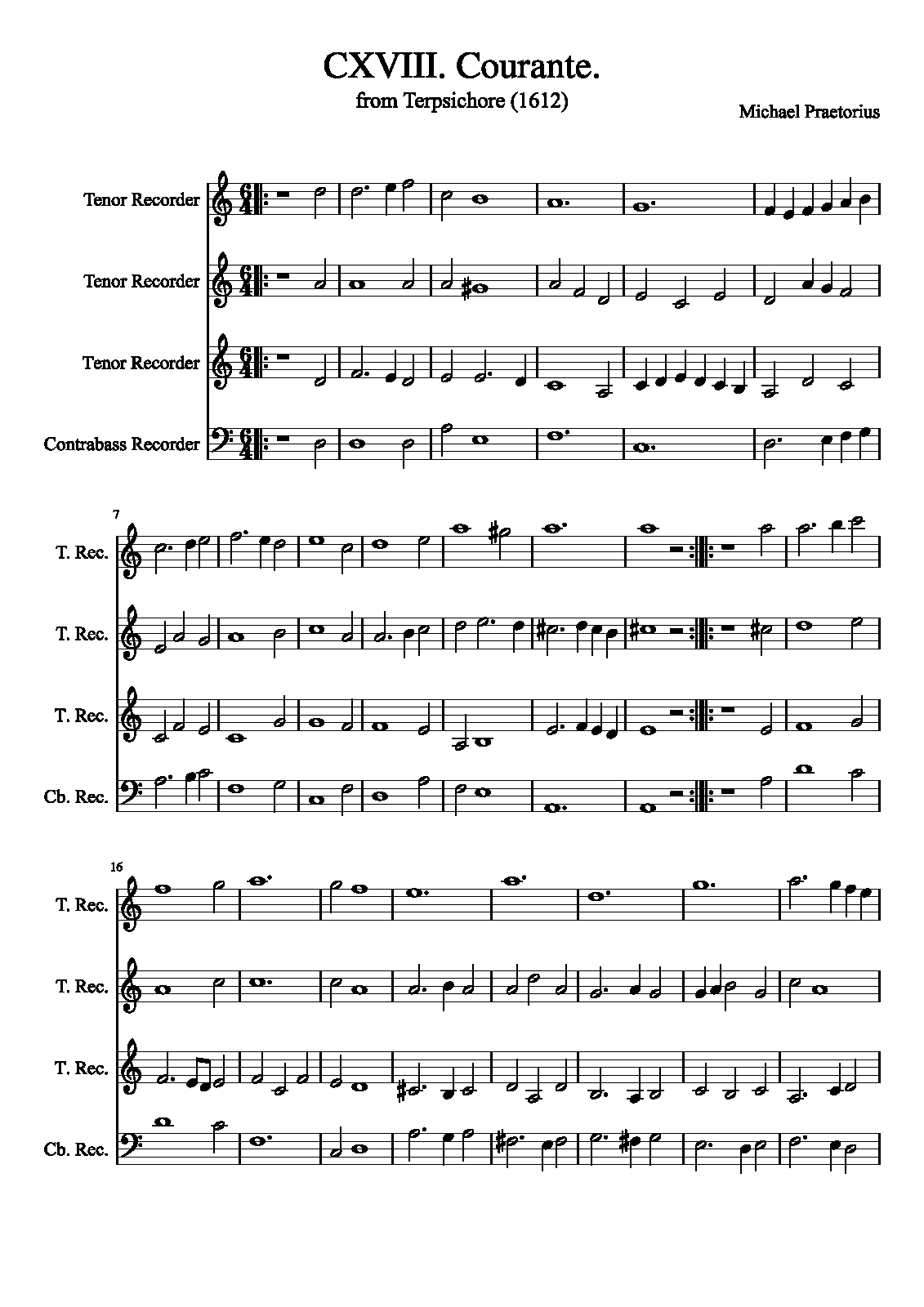 | Extra Information | These pieces were assembled and arranged by Praetorius for his 1612 collection. It is unknown how many, or if any, of the works in the collection were actually composed by Praetorius as opposed to being popular dance tunes arranged by him. The instrumentation is not specified in the original, and simply listed as "à 4". |