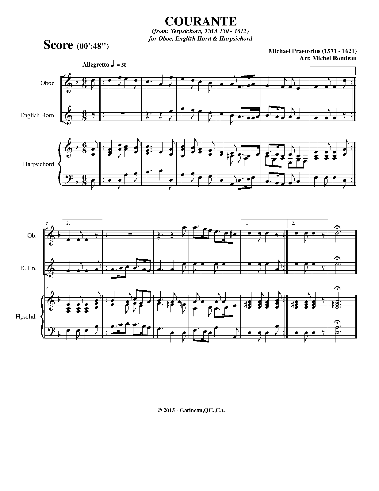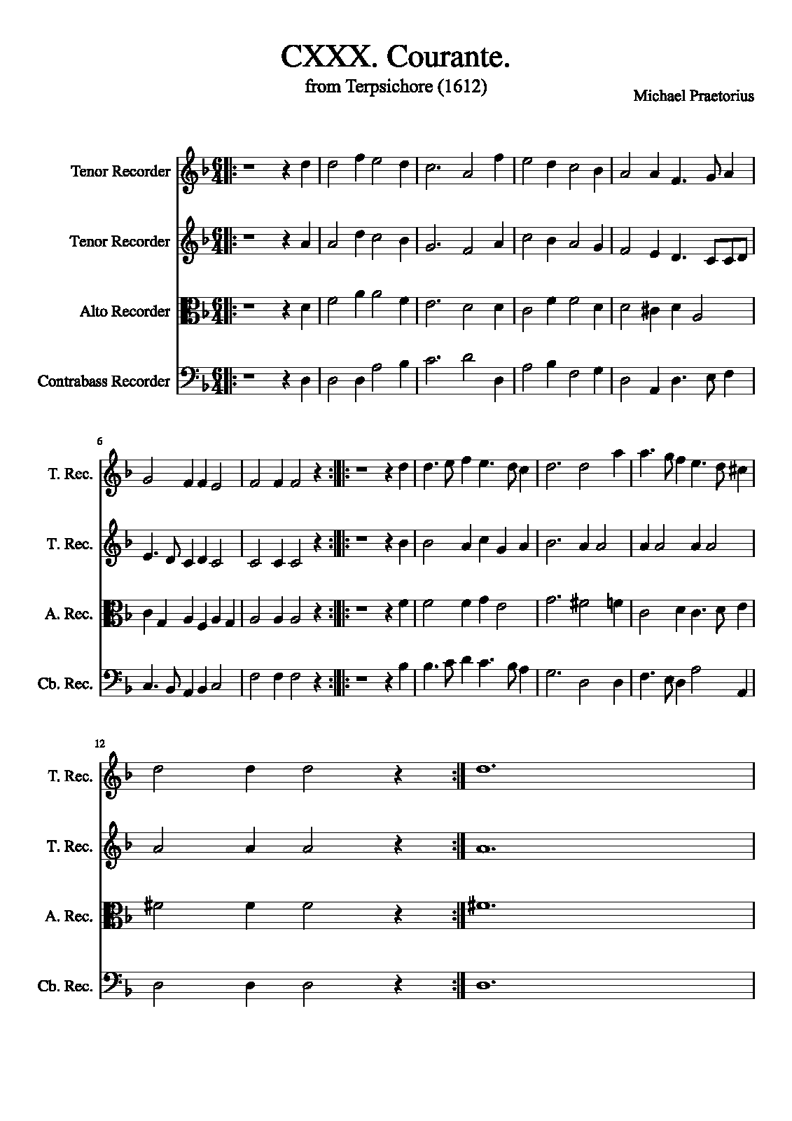| Extra Information | These pieces were assembled and arranged by Praetorius for his 1612 collection. It is unknown how many, or if any, of the works in the collection were actually composed by Praetorius as opposed to being popular dance tunes arranged by him. The instrumentation is not specified in the original, and simply listed as "à 4". |