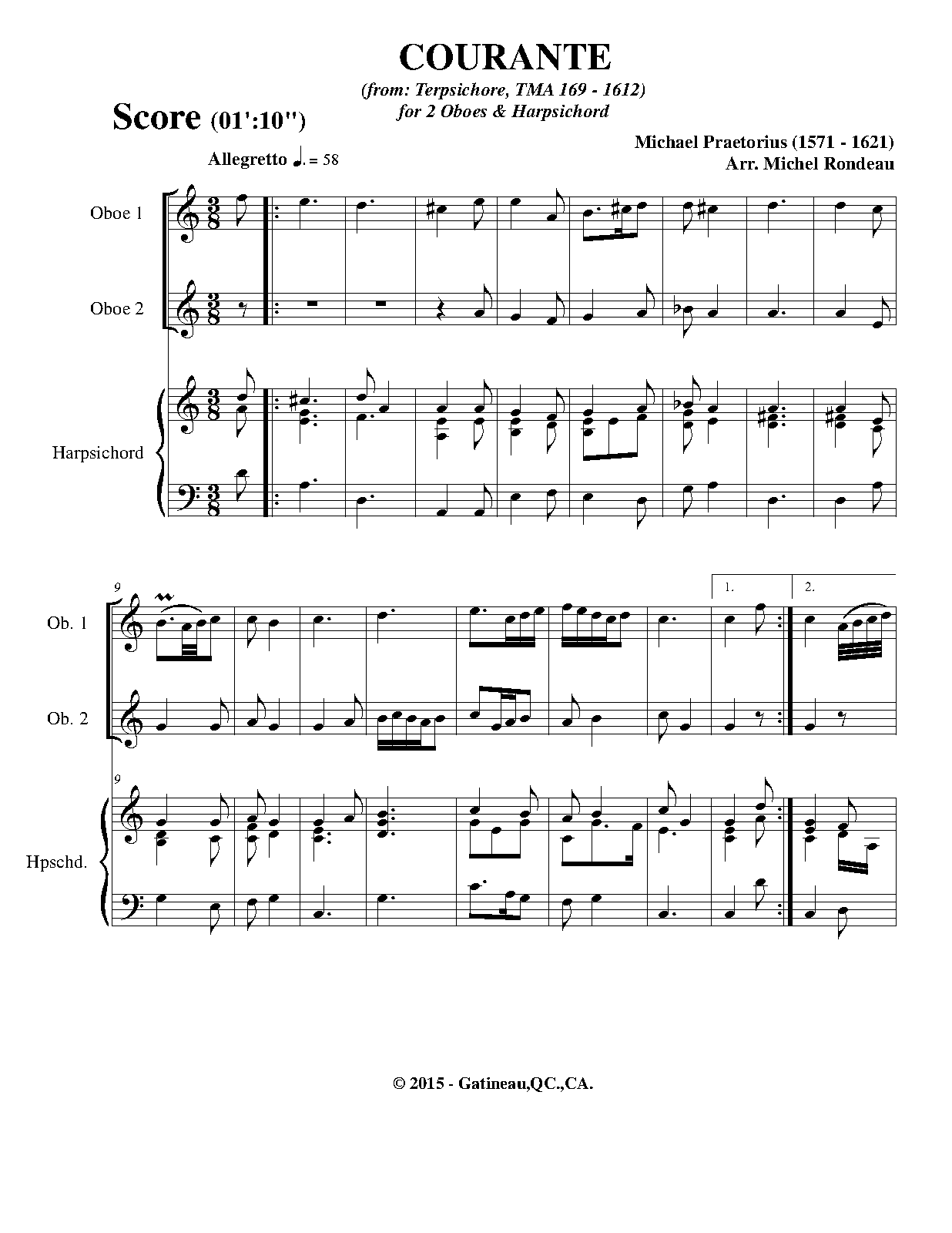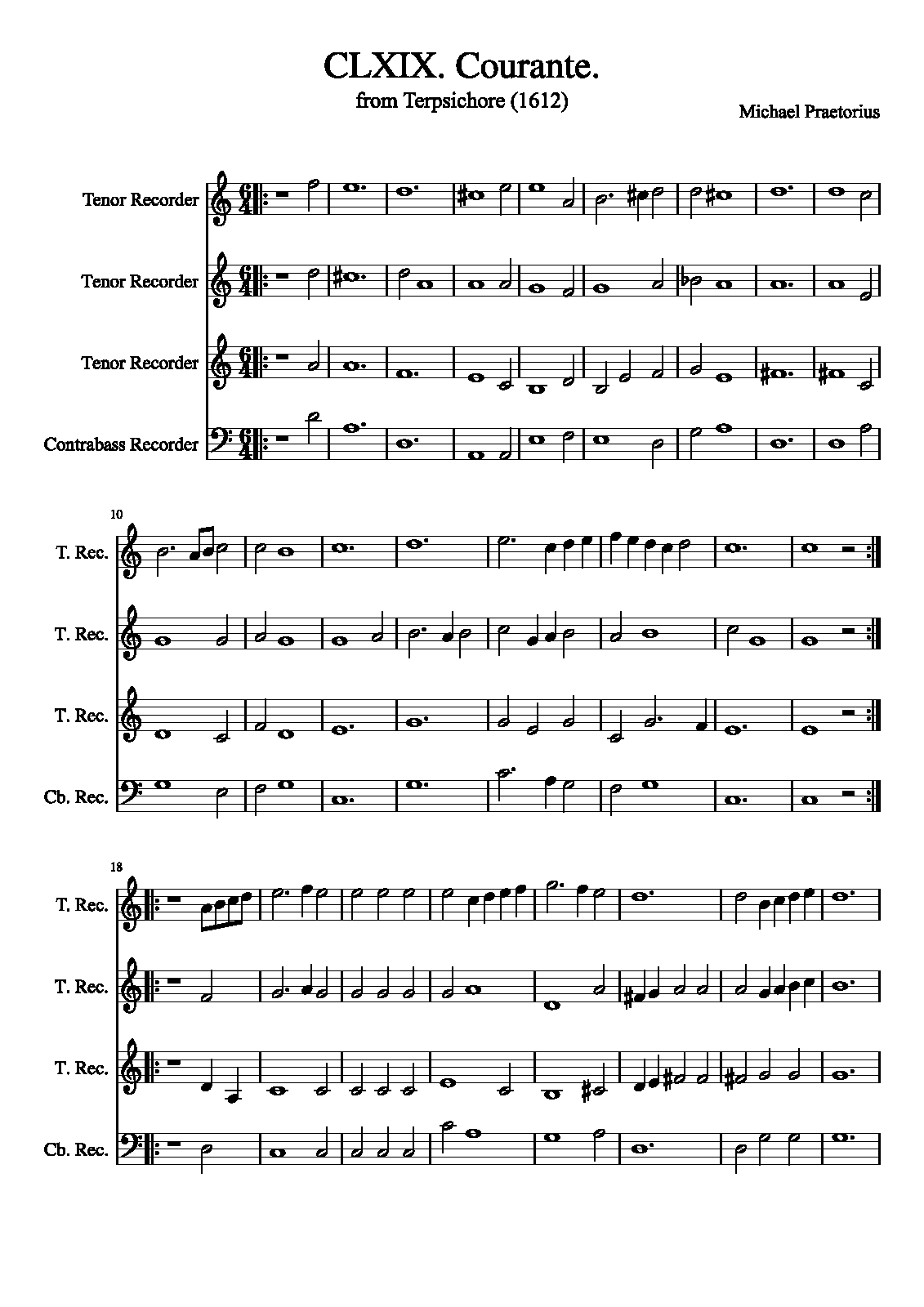 | Extra Information | These pieces were assembled and arranged by Praetorius for his 1612 collection. It is unknown how many, or if any, of the works in the collection were actually composed by Praetorius as opposed to being popular dance tunes arranged by him. The instrumentation is not specified in the original, and simply listed as "à 4". |
