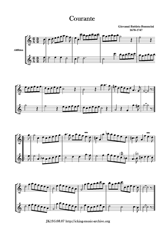 Bononcini's op.4 is Arie, correnti, sarabande, gighe, & allemande, vn, vle/spinet (Bologna, 1671); ed. M. Abbado (Milan, 1968), so these may have been originally a courante and allemande for keyboard. However, instrumentation cannot be tagged until this can be confirmed. Tagged as undetermined instrumentation for now.
