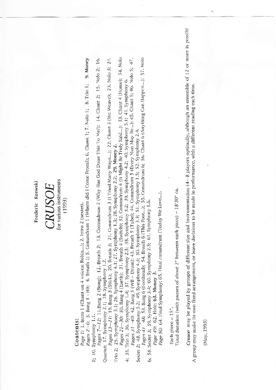 "Crusoe" may be played by groups of different size and instrumentation (4–8 players optimally, although an ensemble of 12 or more players is possible). A group may make its own fixed arrangement, or leave decisions to be made in performance, with a different reading each time.
