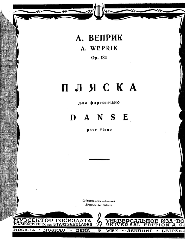 On Theme ‘El Yivneh Hagalil’. This theme was used by many Jewish-Russian Composers such as Aleksandr Krein and Joseph Achron. Veprik also composed 3 more dances on the same theme, and these were published as Op.13b. Recorded by Jascha Nemtsov on EDA.