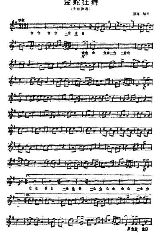 This piece was written by Nier Er for the Bai Dai Orchestra composed of Chinese traditional instruments which he set up and directed, but his original orchestration was not included in the Nie Er quanji (聂耳全集, collected works of Nie Er, 1985?) for seeming "weak and limited" by modern standards, so a re-orchestration was included instead (source: Liu Jingzhi, A Critical History of New Music in China). It has been re-orchestrated by Gu Guanren (b.1942) and more recently by Tang Jianping (b.1955). It is therefore very difficult to figure out what material is authentic, if the original orchestration survives at all.