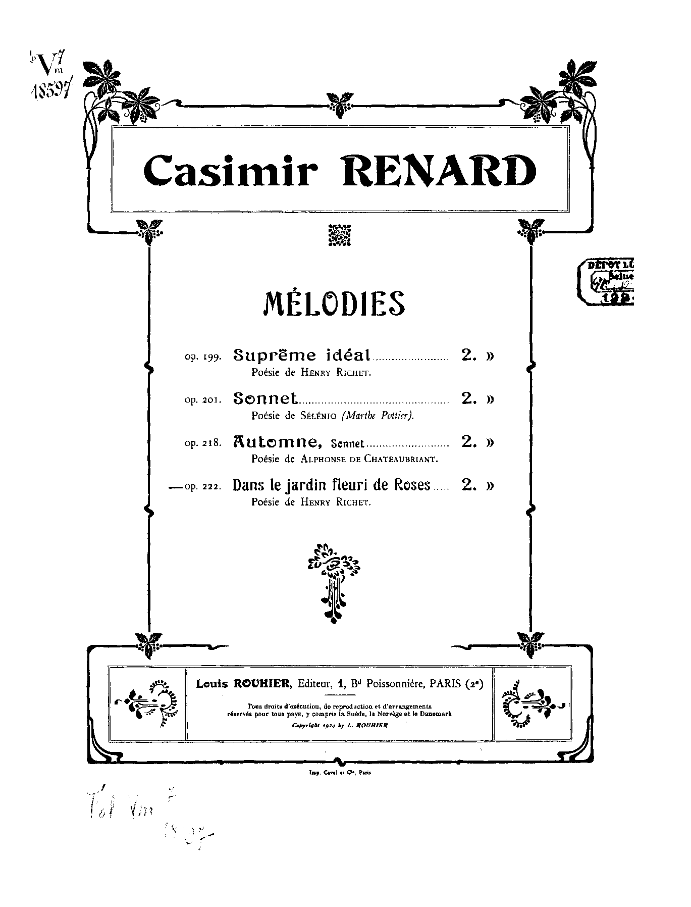Publication noted in the Bibliographie de la France : 113e année, 2e série, Nº 41, 10 Octobre 1924, p.544, reg.2625.